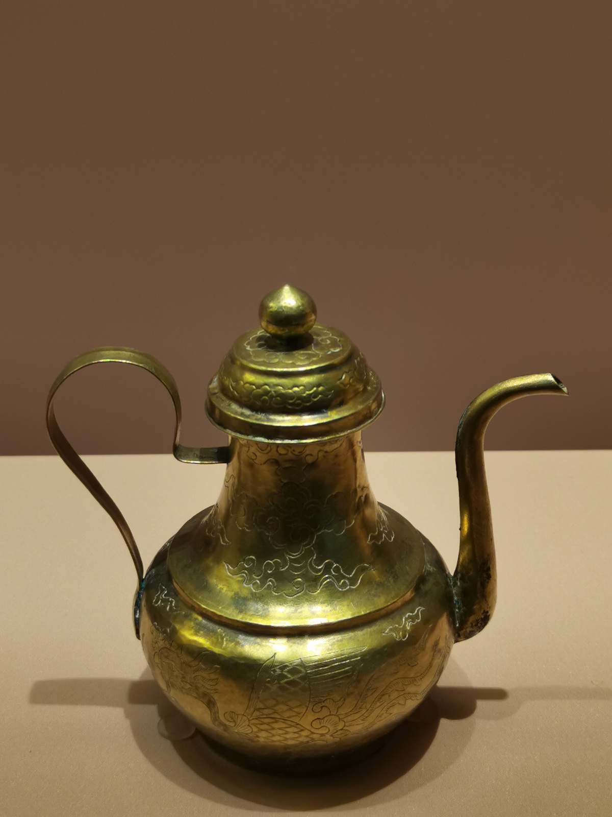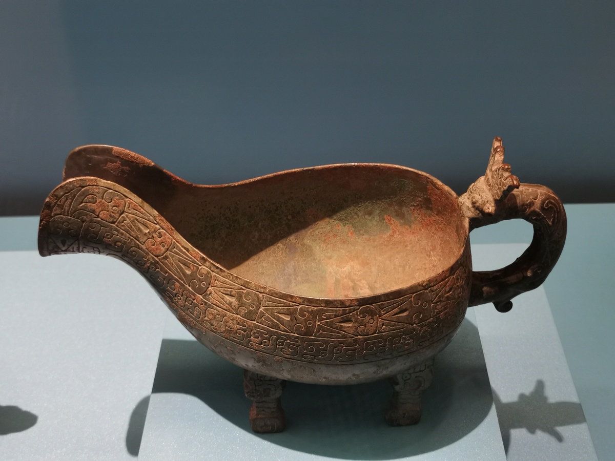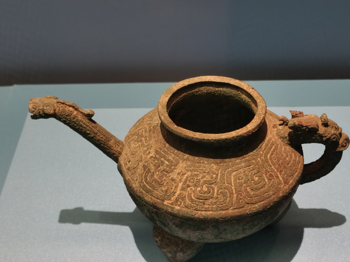 此次展览上,有一件来自国家博物馆的窃曲纹龙首三足铜盉,年代为西周,果然延袭了商代的敦厚凝重之感。
