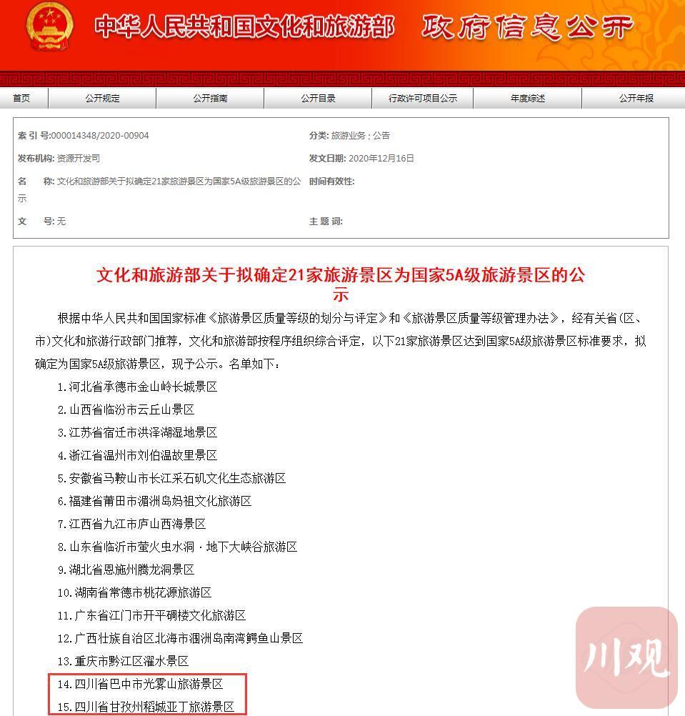 近日,文化和旅游部按程序组织综合评定,21家旅游景区达到国家5A级旅游景区标准要求,拟确定为国家5A级旅游景区,予以公示。四川两个景区进入公示名单,分别为巴中市光雾山旅游景区、甘孜州稻城亚丁旅游景区。