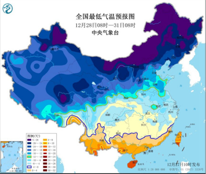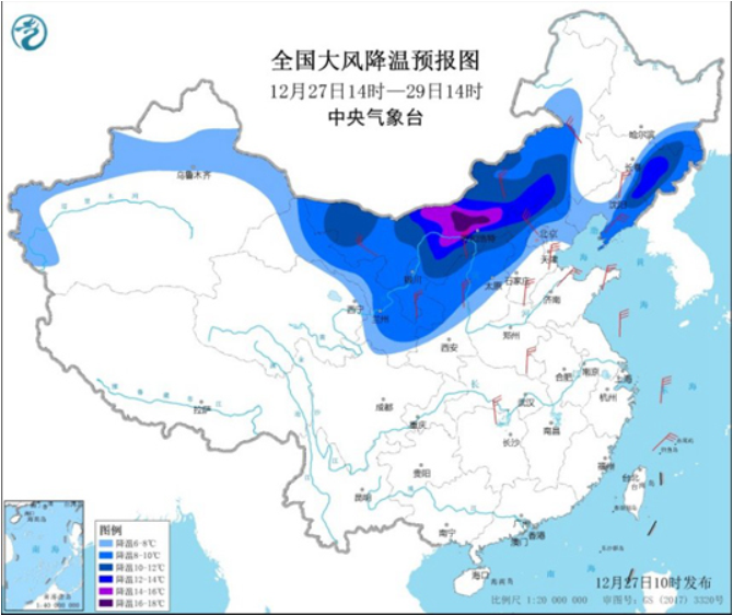 请看,中央气象台还有一张12月27日到29日的全国大风降温预报图