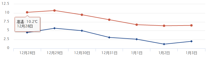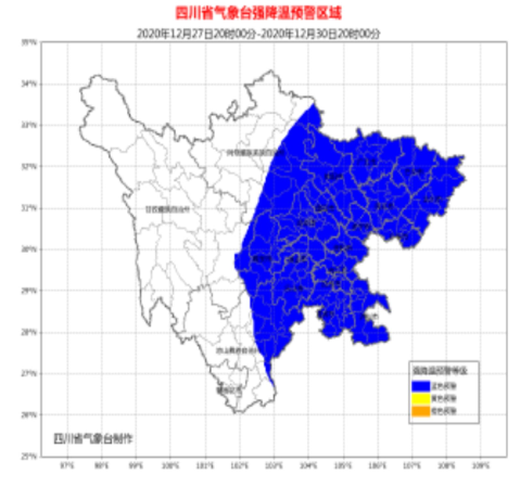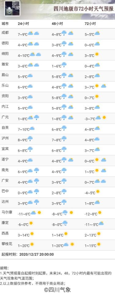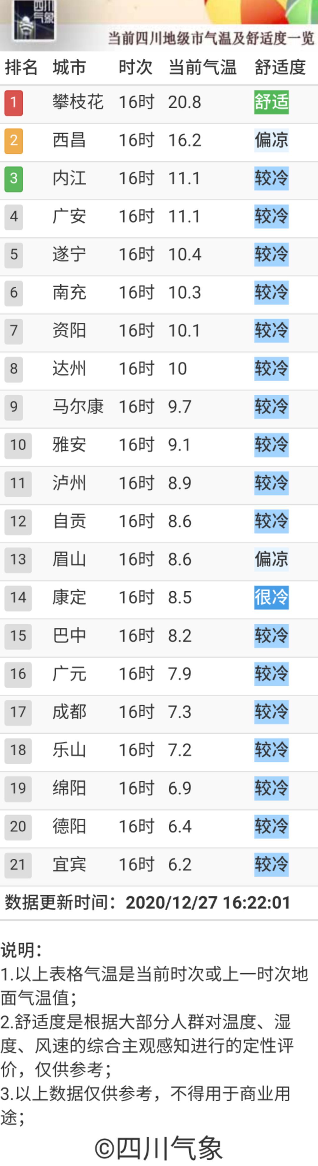 ★ 12月27日16时,四川省气象台发布强降温蓝色预警:受北方冷空气影响,28日开始到31日我省自北向南将有一次明显的降温降水天气过程,日平均气温将累计下降4~7℃,盆地最低气温将从3~5℃下降至-1~2℃,冷空气影响时有4~6级偏北风,山口河谷地区风力可达7级或以上;降水量普遍以小雨为主,盆周山区及高海拔地区有雨夹雪或小雪,易出现道路结冰,请注意预防。