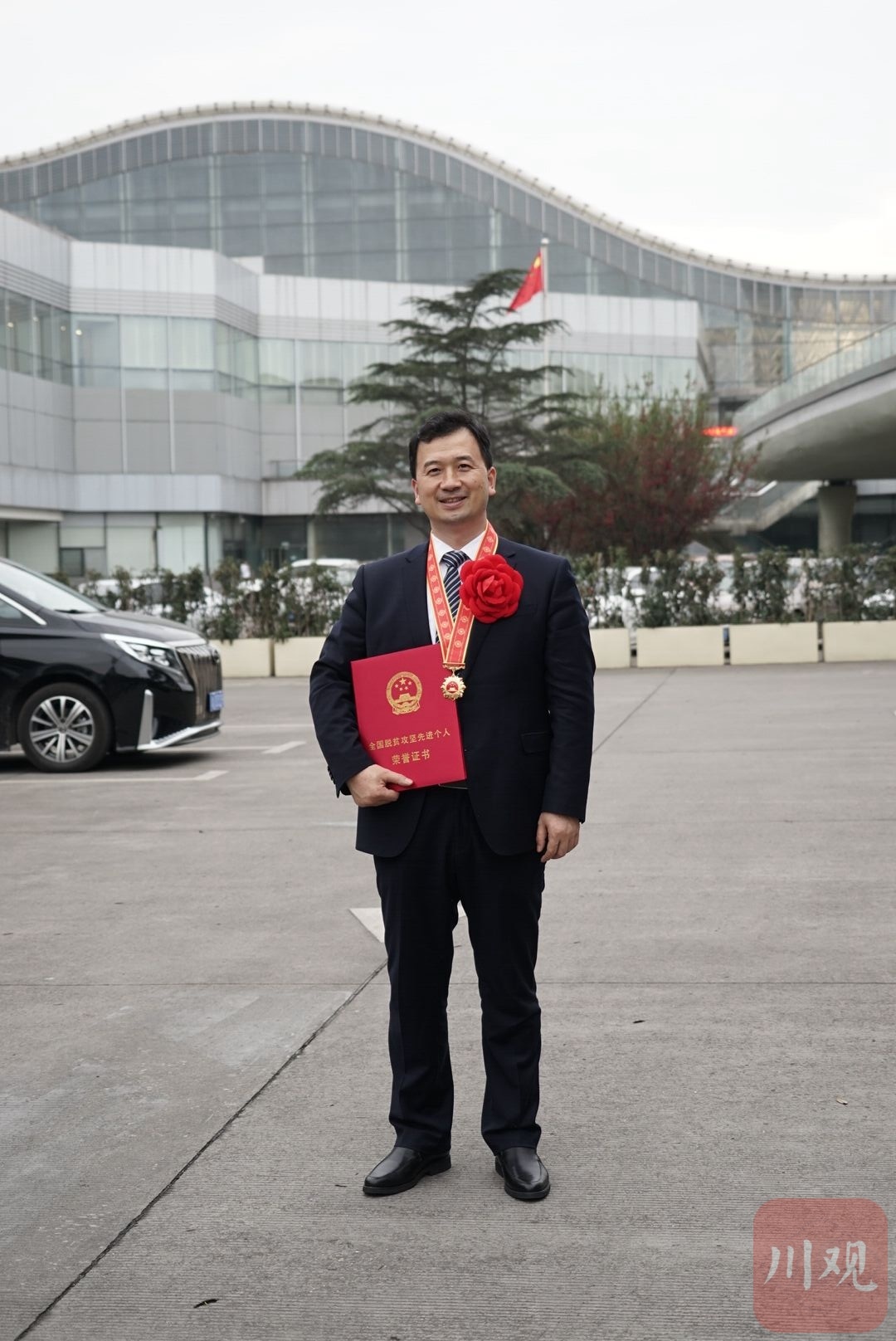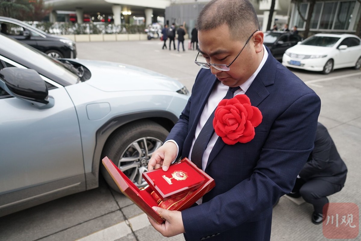 2月25日18时许,成都双流国际机场T1航站楼贵宾服务中心C区停车场,驶入几辆中巴车。车门打开,一身正装、挂奖牌、戴红花的获奖代表们快步下车,合影留念。
