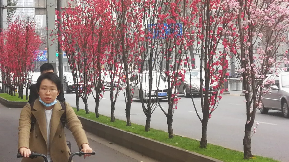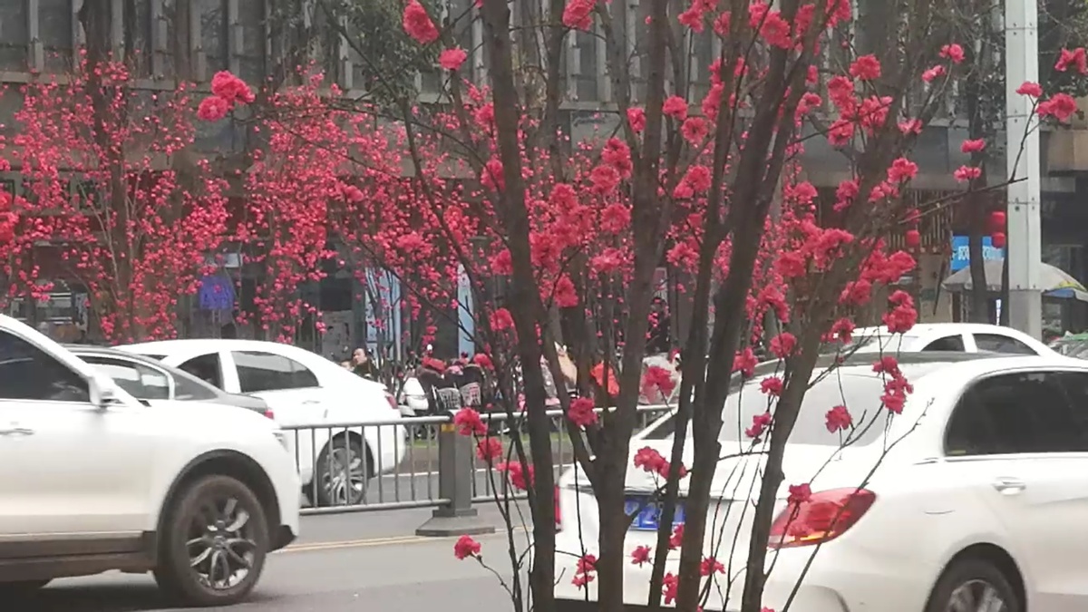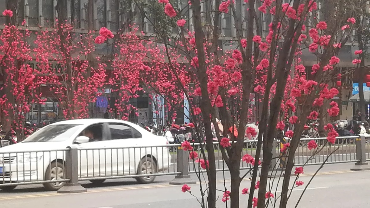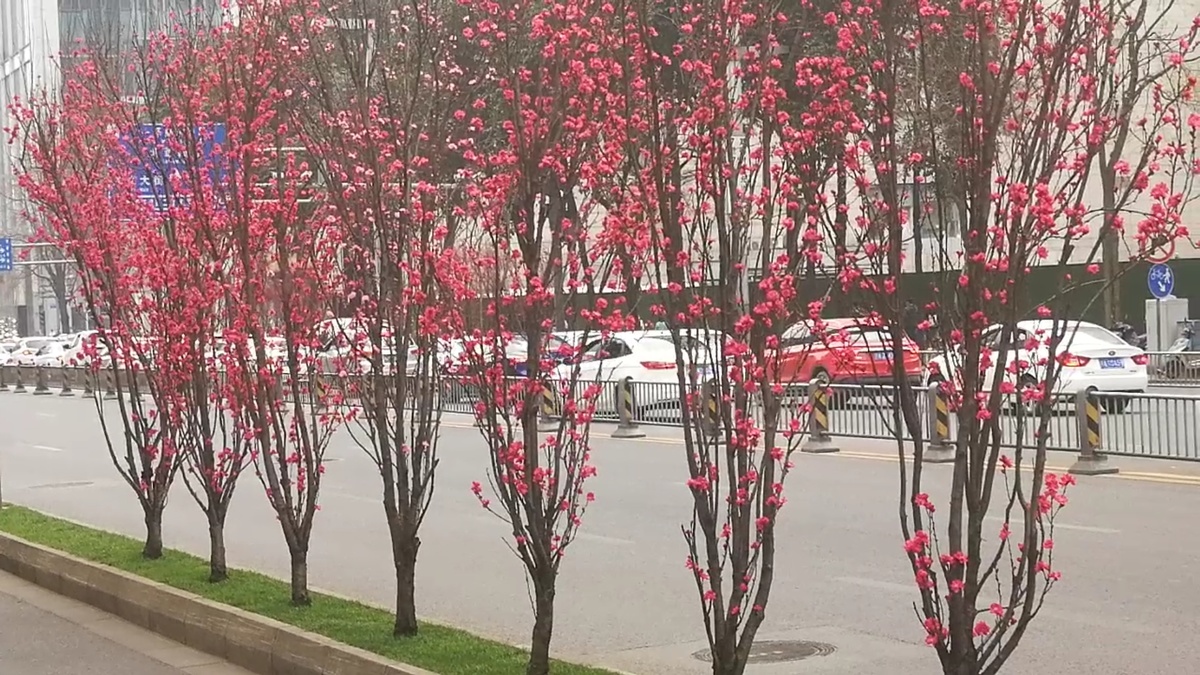 2月25日,成都市蜀都大道两侧绿化带上的观赏桃花开始盛开,吸引过往市民们前来游览观赏。观赏桃花有粉红色、白色、红色给公园城市增添了多彩春天气息。