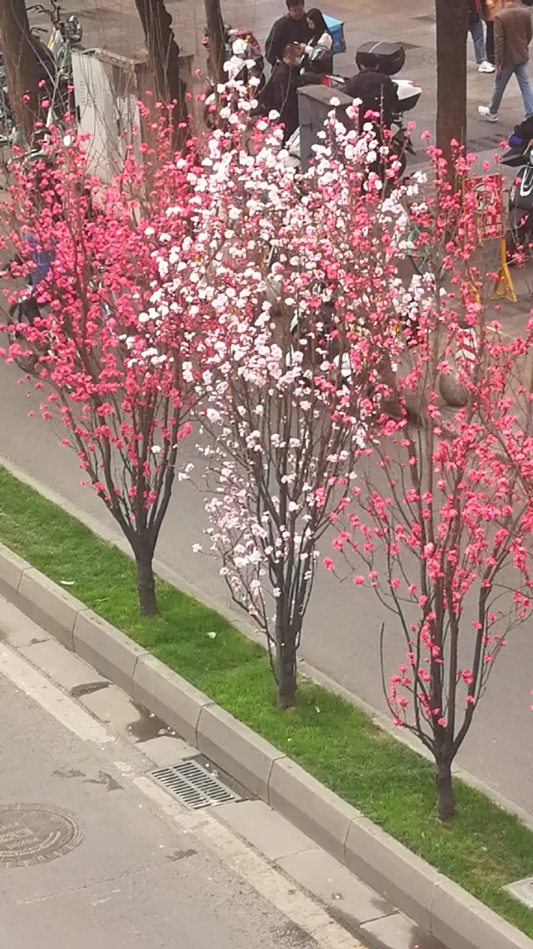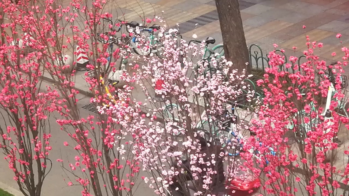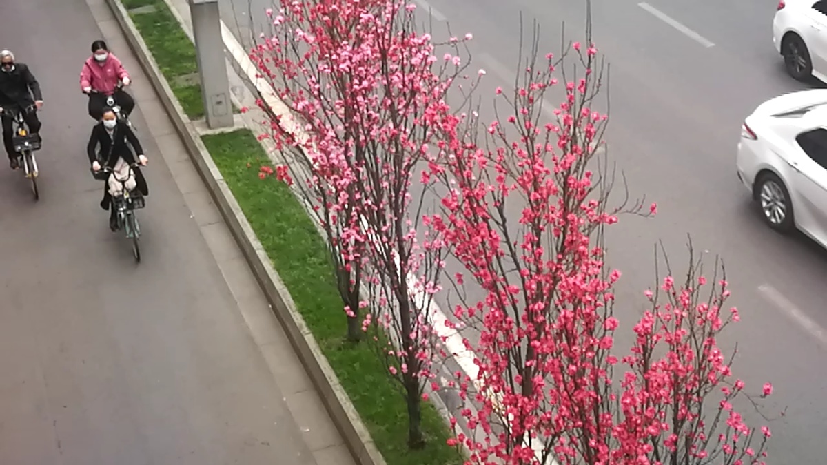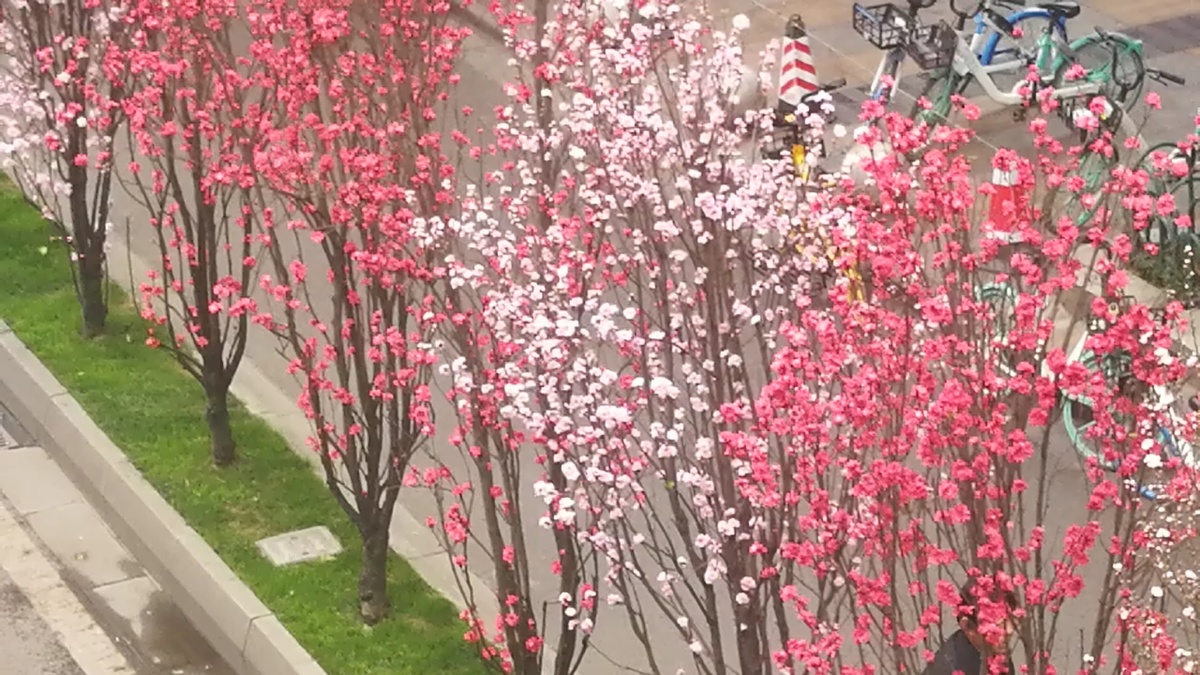绿化带上的观赏桃花开始盛开吸引过往市民们前来游览观赏。