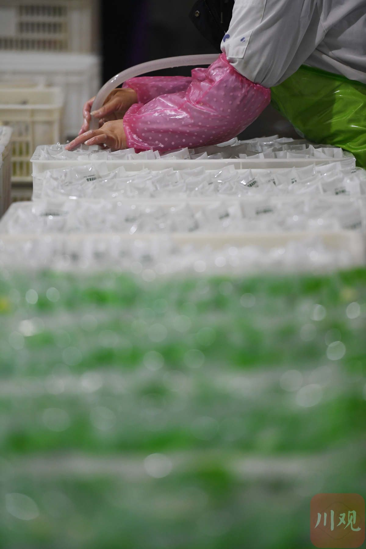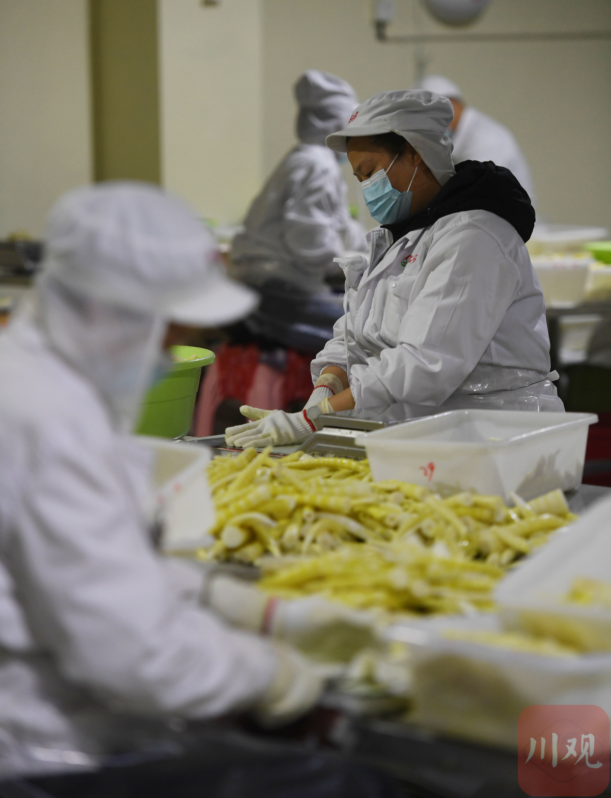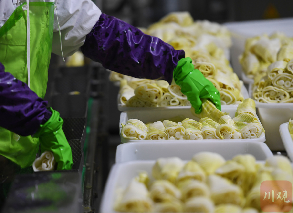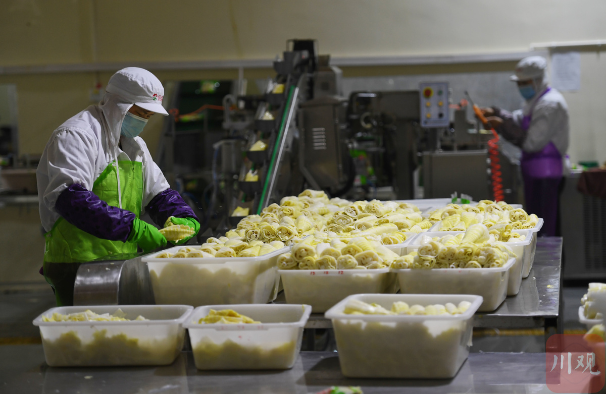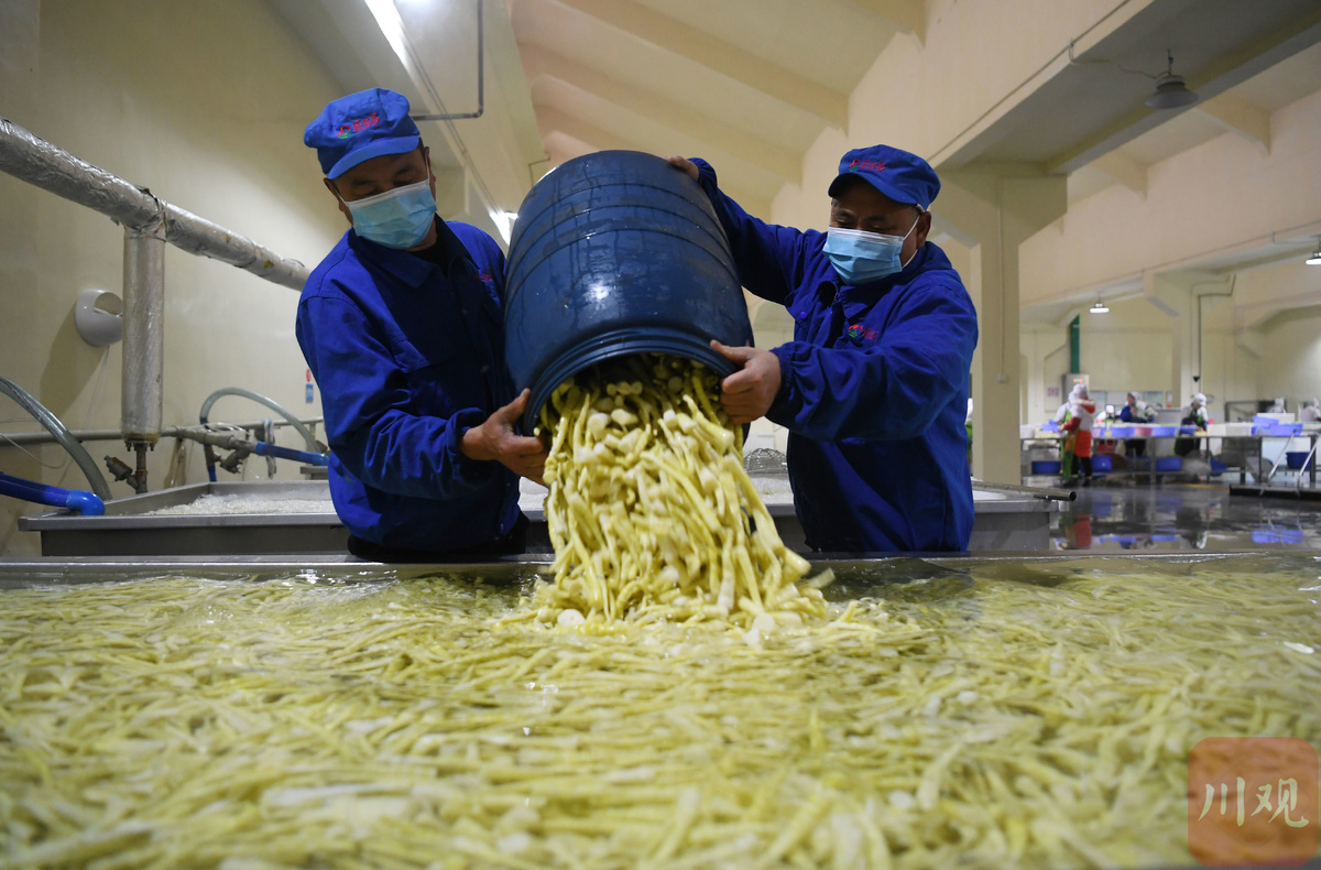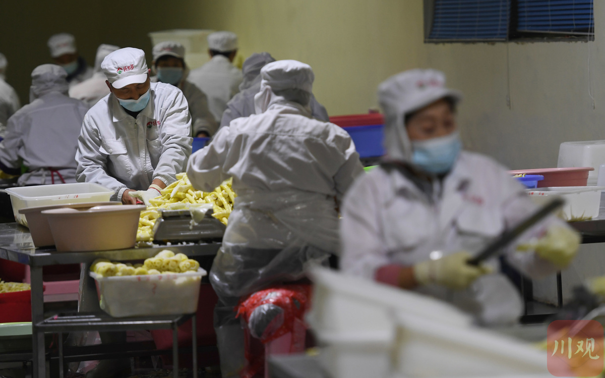 3月10日,位于德阳市旌阳区柏隆镇的一家食品企业车间内,工人们正在清洗、装捡、包装火锅脆笋,准备装车发货。