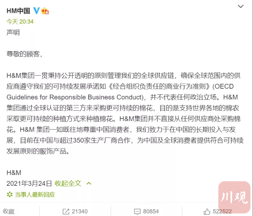 H&M连夜发布最新回应,言辞中却毫无道歉之意。再遭狠批!成都H&M门店的情况如何?