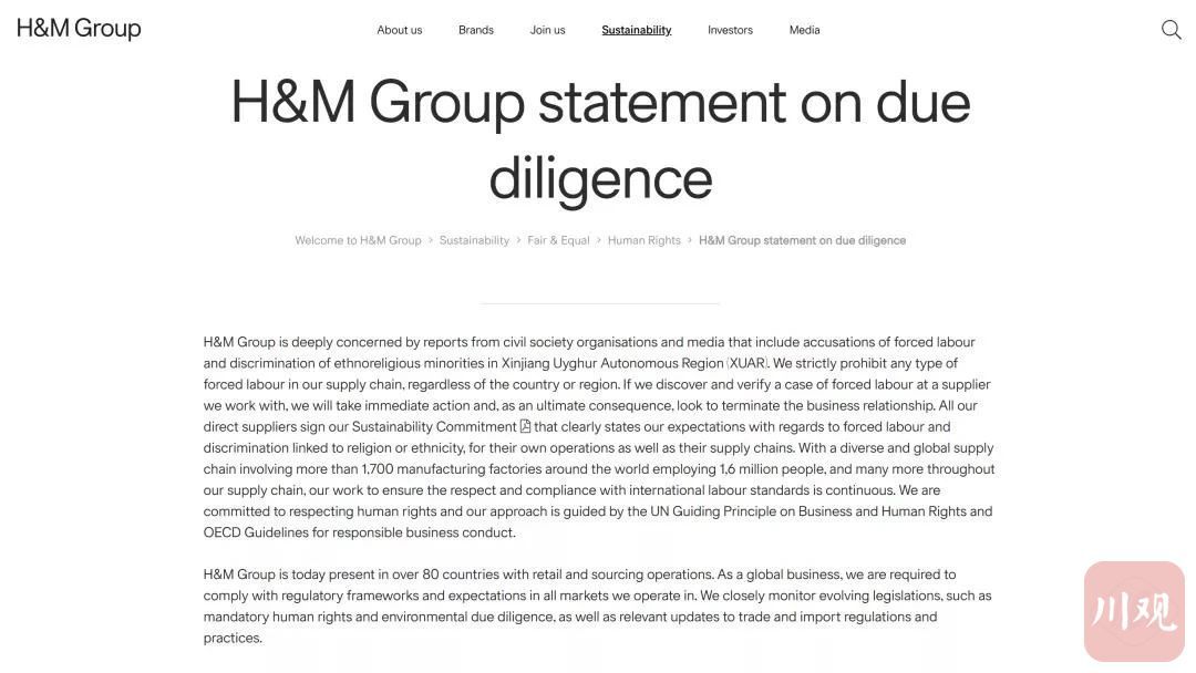 H&M集团在声明中表示,“我们不与位于新疆的任何服装制造工厂合作,也不从该地区采购产品/原材料。”
