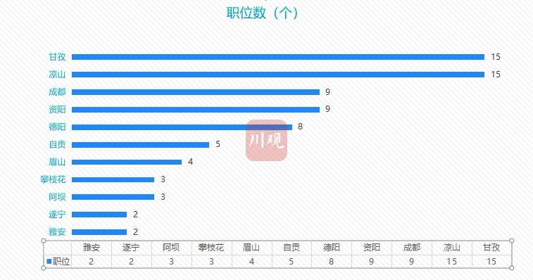 本次公开招聘的75个职位分布在11个市(州),职位数从高到低分别为:甘孜15个、凉山15个、成都9个、资阳9个、德阳8个、自贡5个、眉山4个、攀枝花3个、阿坝3个、遂宁2个、雅安2个。其中,分布在甘孜州、阿坝州、凉山州等三州地区的职位共计33个,占比44%。