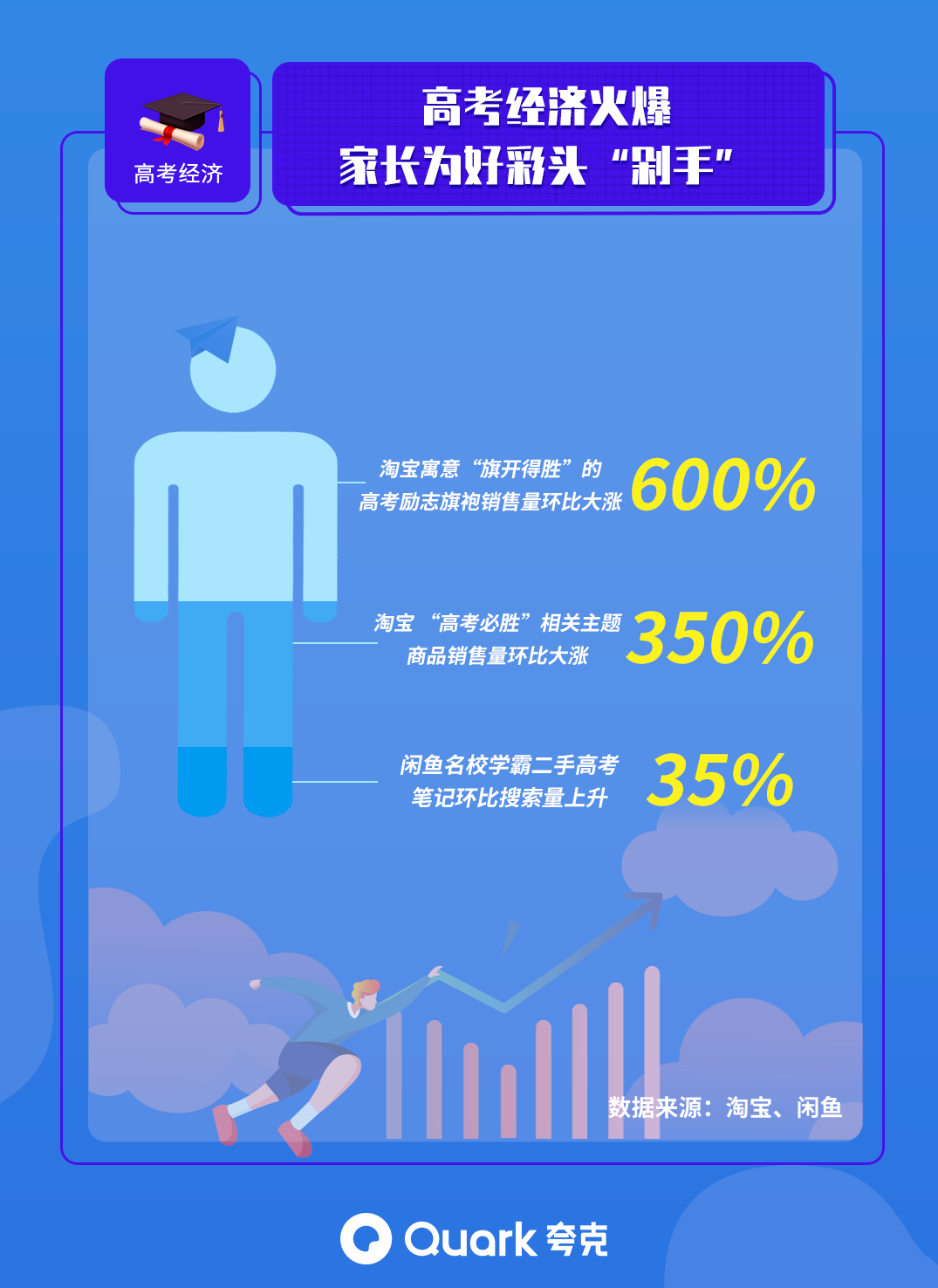 6月4日,记者从淘宝获悉,考前一个月,寓意“旗开得胜”的高考励志旗袍在淘宝销售量环比大涨600%,“高考必胜”相关主题商品销售量大涨350%。闲鱼名校学霸二手高考笔记环比搜索量上升35%。