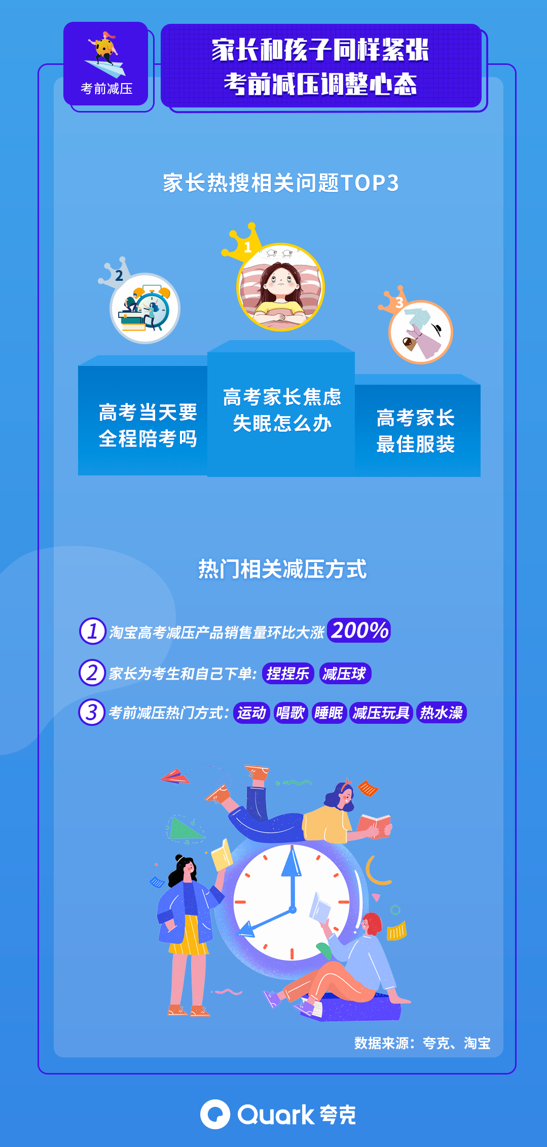 考前保持平常心,如何减压成为关键。夸克数据显示,运动、唱歌、睡眠、减压玩具、热水澡都成为热搜的减压方式。淘宝高考减压产品销售量5月份环比大涨200%。捏捏乐,减压球成为考生和家长考前情绪纾解神器。