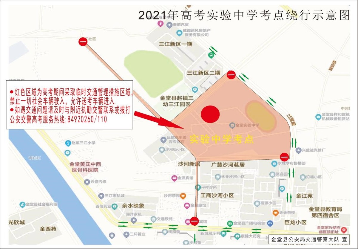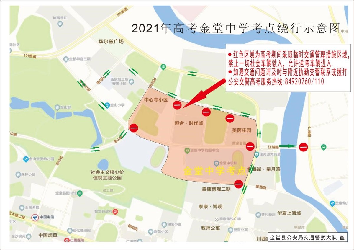 上述区域内道路禁止社会车辆通行,允许接送考生车辆进入。请广大驾驶人高考期间注意进行绕行,高考期间严禁鸣笛,共同营造良好的考试环境。在送考路上如遇交通管理问题请拨打金堂公安交警#护航高考#服务热线:84920260/110,或向就近路面执勤交警求助,我们将全力护航高考。