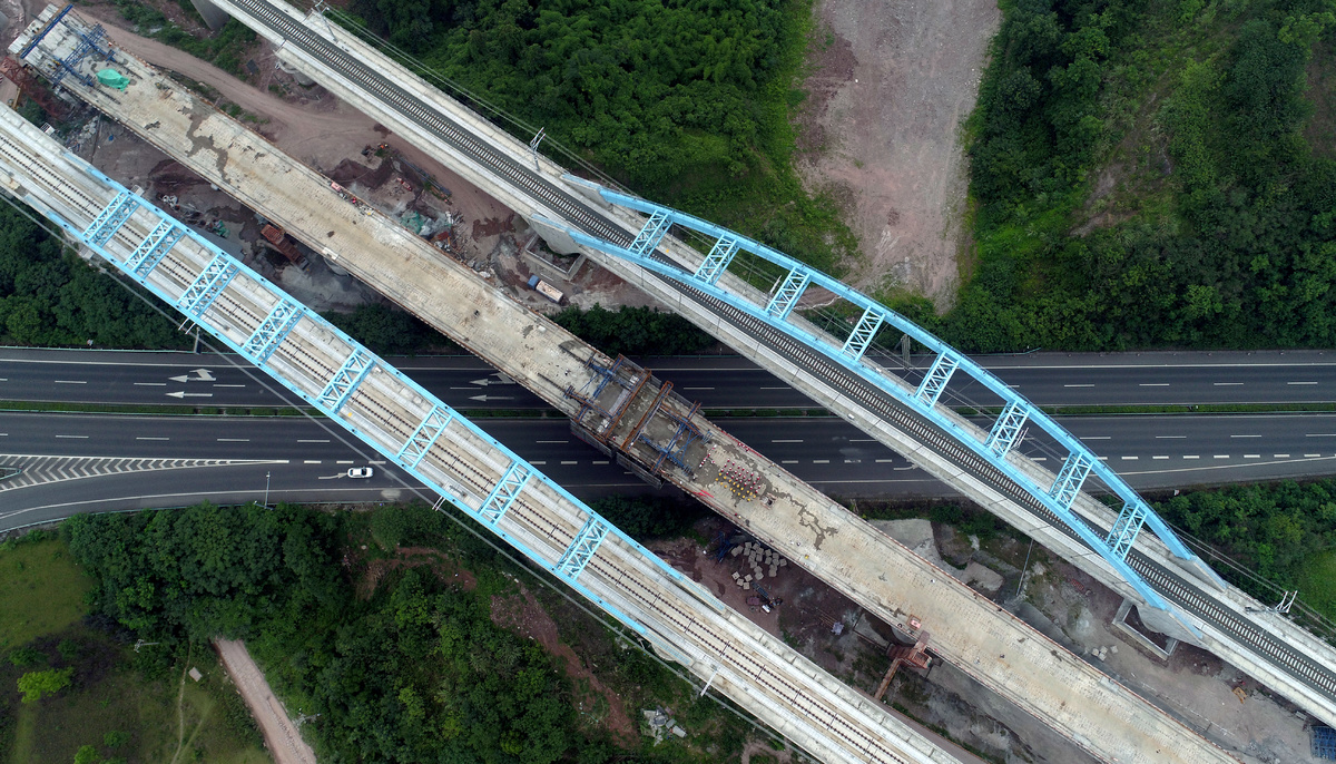 “该桥有着施工组织难度大,安全风险高,控制因素较多等特点。”中铁五局成自项目部项目经理张志坚介绍,该桥设计与施工的最大难点,在于梁部结构及墩台布置需考虑在建绵泸高铁、既有成自泸高速公路、在建自贡至内江快速通道及河流沟渠的影响,还需充分考虑墩台对既有绵泸高铁桥墩的防护设计。