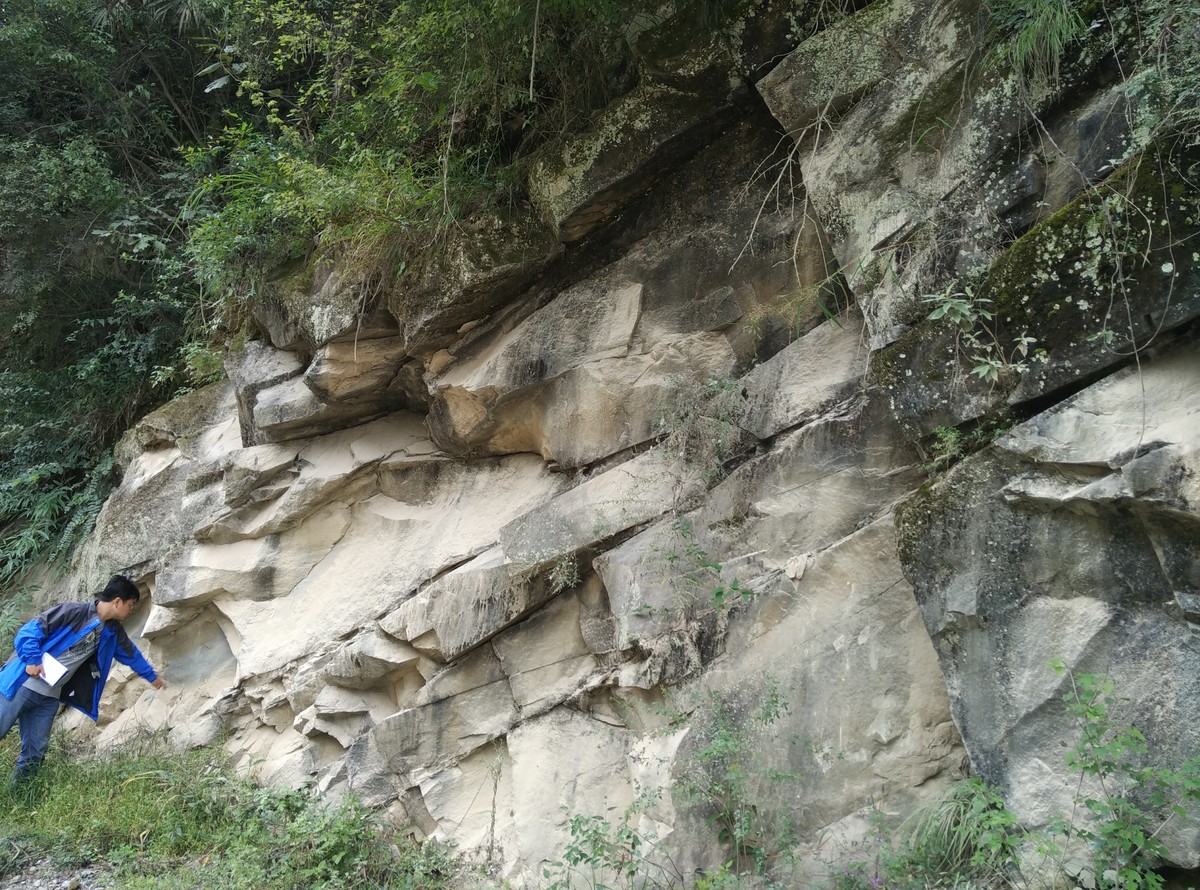 刘晓华拿起地质锤从灰白色岩石上敲下一块小石头,又从背包里拿出稀盐酸试剂,滴上一滴,石头上就像小金鱼一样吐出一串白色泡泡。“这是典型的碳酸岩,这些孔隙和裂缝就是温泉藏身的地方。”刘晓华解释说,这些碳酸盐主要为三叠系、二叠系灰岩地层,他们有很好的储水功能,被称作“储水层”。受地壳运动的影响,这个本该深埋在地下数千米的地层被挤压抬升与剥蚀,部分露出地面,露头部分就是温泉丢给人类的“手绢”。