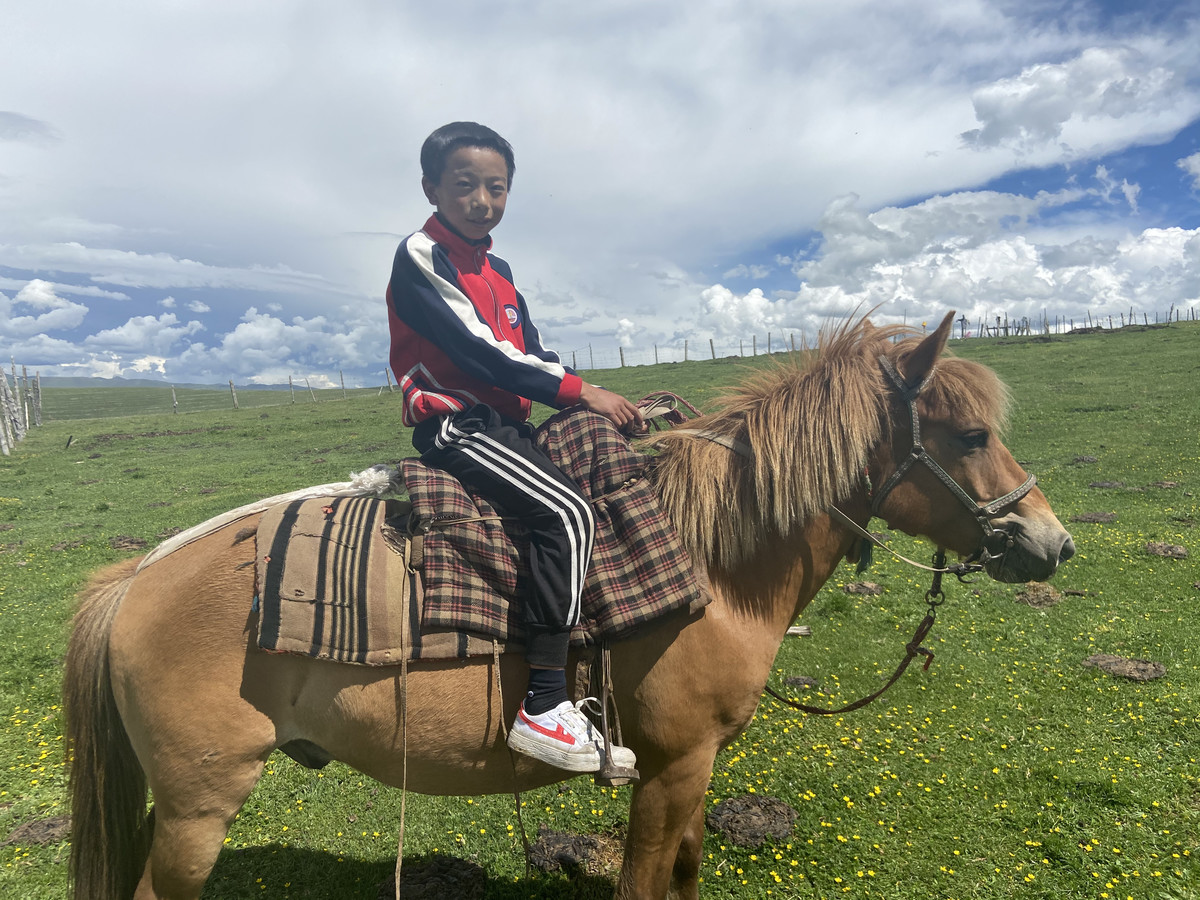 就读宗塔乡中心小学三年级的根秋呷瓦周末会跟着爸爸,带着家中的4匹马儿到降巴牧场做起骑马驰骋的生意。根秋呷瓦为游客提供马匹或者牵马,带着游客从牧场口到牧民家中“做客”。“来回一趟大约3公里,可以收入100多元。”根秋呷瓦负责的马儿温顺、乖巧,深受客人喜爱,旺季一天下来,可以收获500多元。