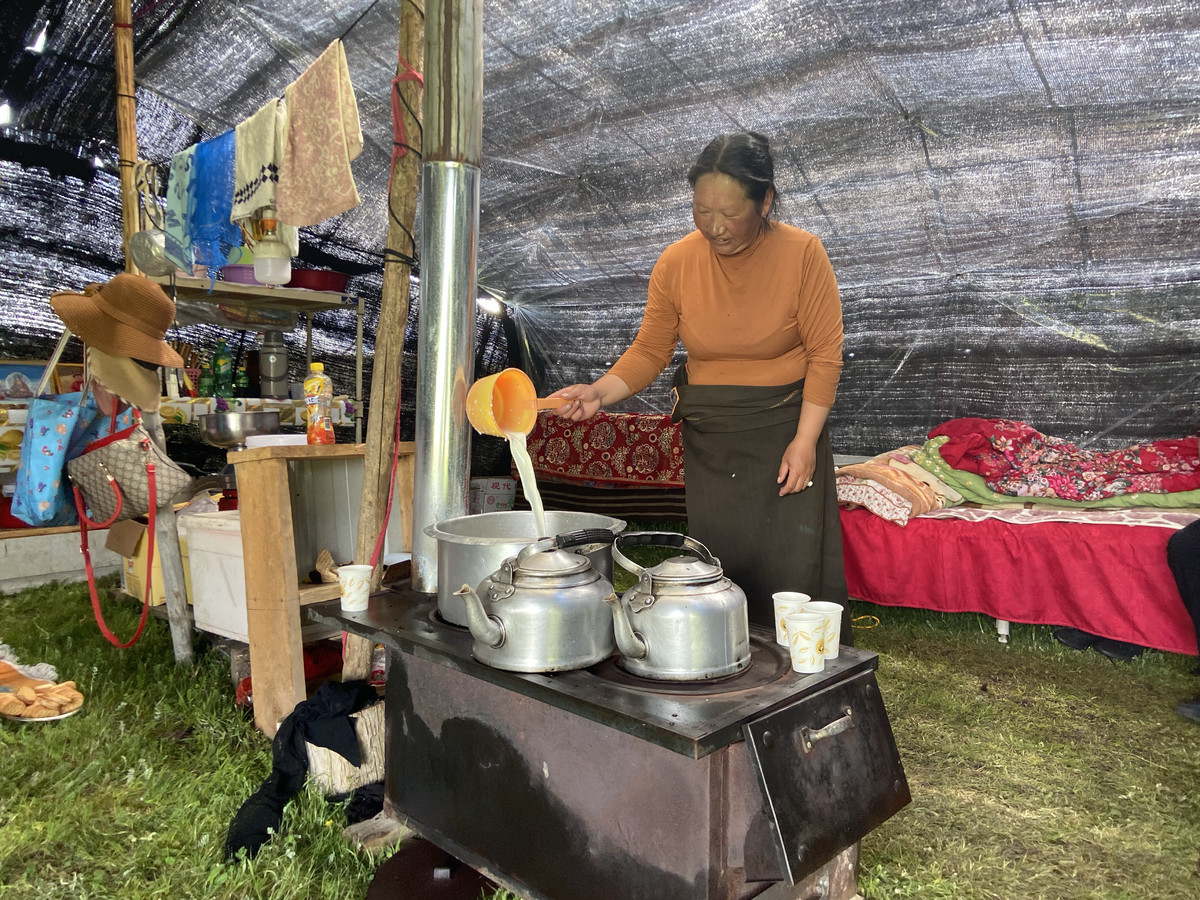在宗塔草原,深度体验游是一大重要特色。在降巴村,40岁的郎措知道媒体大咖到来,提前准备满满一桶新鲜的牦牛奶供大家品尝。“游客喜欢到降巴牧场来骑马、赏风景、体验牧区生活,有的游客会跟着我挤奶、打酥油、吃酸奶、泡酥油茶,往往他们会给予一些体验费。”一笔笔体验费,让郎措不用出家门、不需特意花心思,就能获得额外的收入。“一年下来增收2000多元,非常开心。”说起这些,郎措的喜悦溢满脸颊。