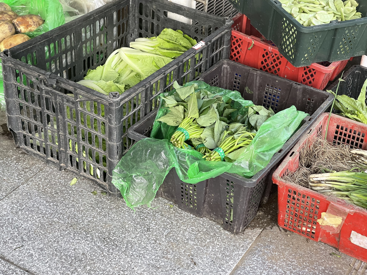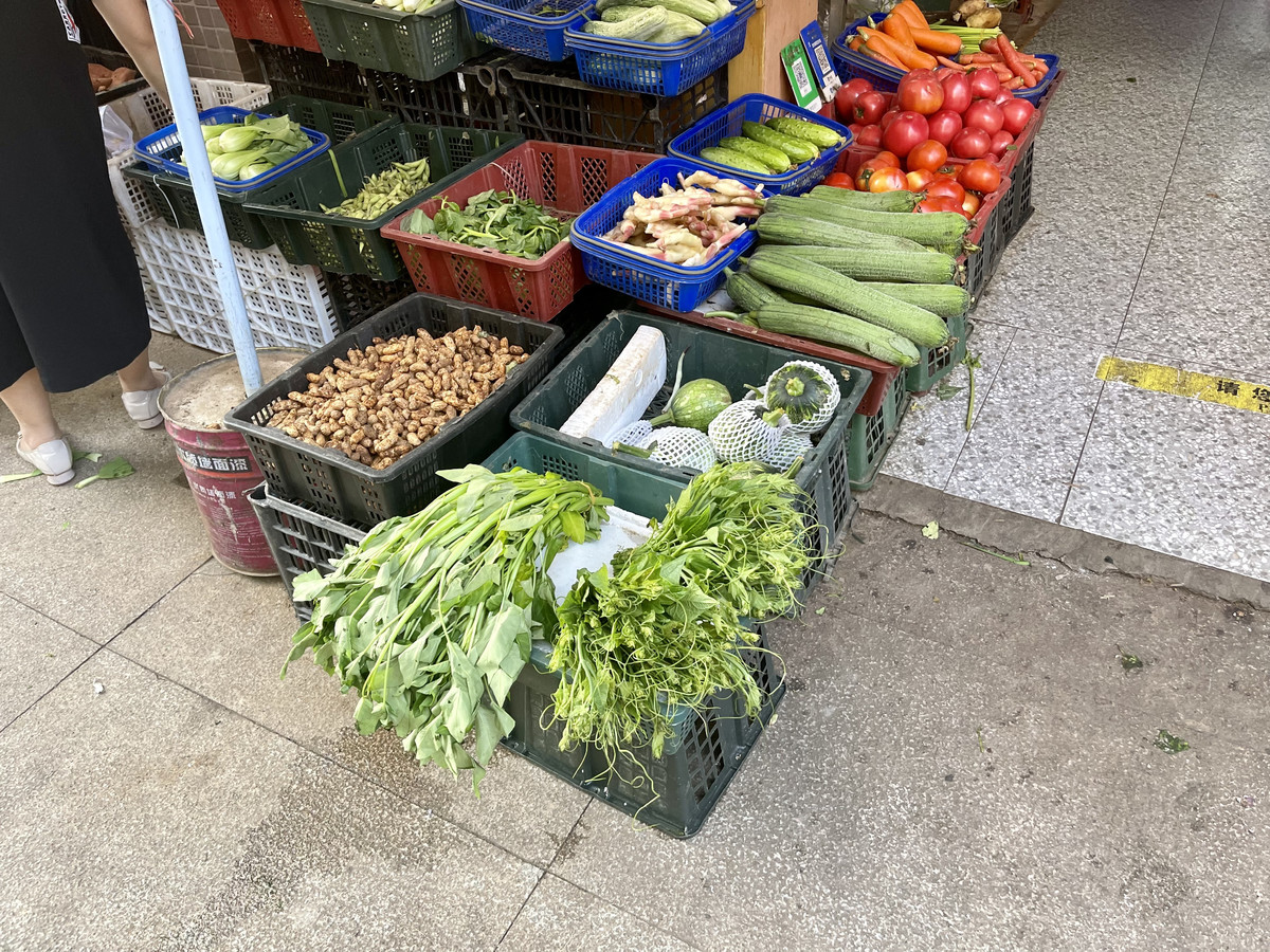 黄瓜、莴笋、豇豆、西红柿、土豆、油麦菜等价格也非常实惠,每斤1-3元。空心菜等绿叶蔬菜则被扎成一小把一小把卖,基本上是1-2元就能买小把。