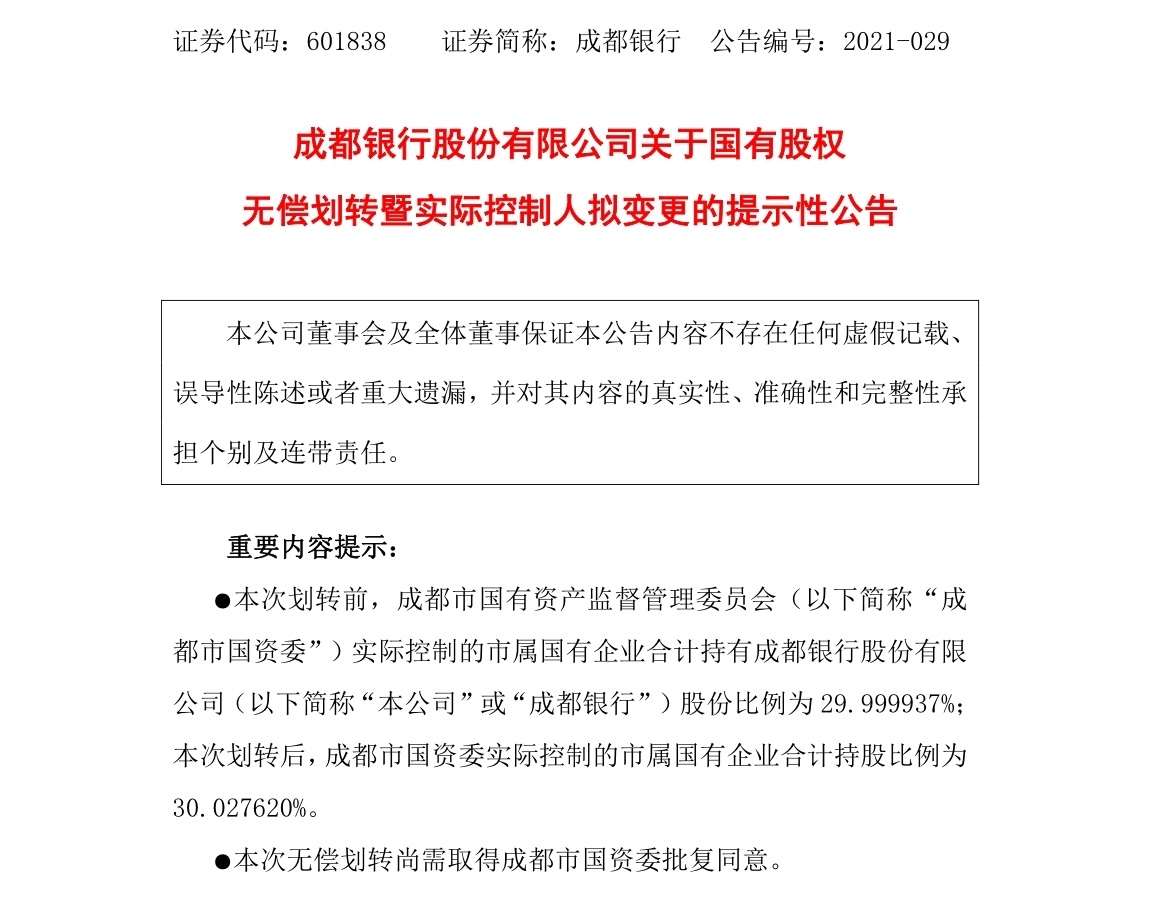 6月23日晚间,成都银行公告称,根据成都市委、市政府进一步加强成都市金融资本规范化、专业化管理的相关要求,成都市金堂县拟将下属的成都天府水城城乡水务建设有限公司持有的成都银行100万股股份无偿划转给成都市国资委下属企业成都欣天颐投资。成都银行由无实际控制人变更为成都市国资委。