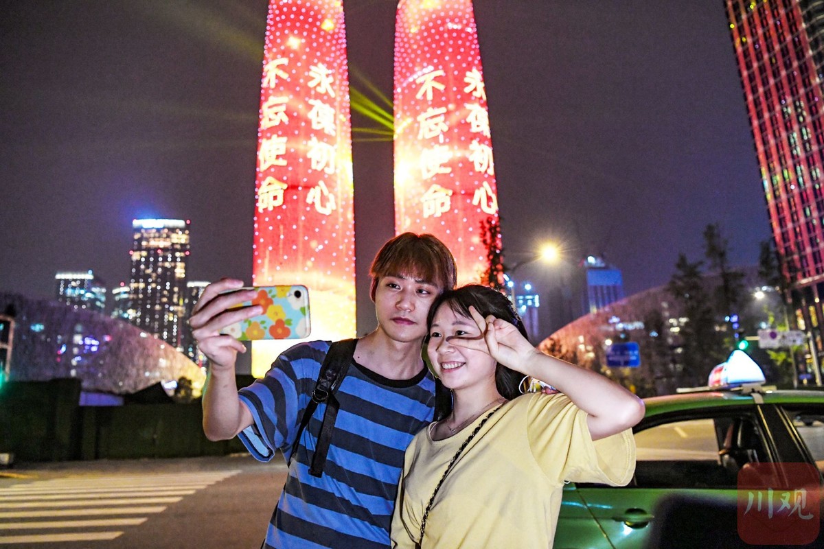 这是成都庆祝中国共产党成立100周年灯光秀的其中一个点位。当晚,天下小雨,仍然有许多市民在双子塔下驻足观看,用手机记录这个特殊的场景。
