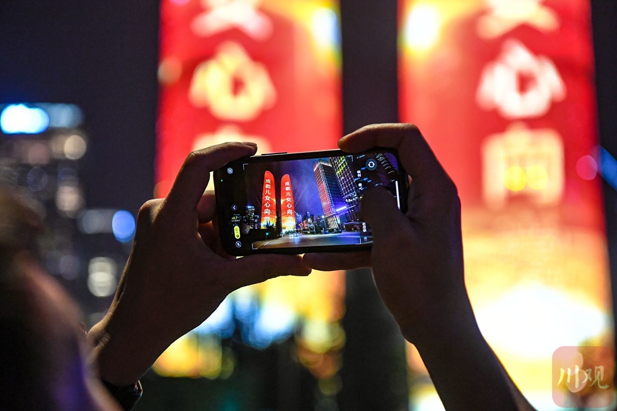 与此同时,杨永生也在旁边驻足观看。他是一名来自国家电网凉山供电公司的扶贫干部,昨天刚来成都参加单位建党百年的庆祝活动。今晚刚好开完会路过此地,看到建党百年主题灯光秀,内心非常激动。“我从2016年开始投入脱贫攻坚事业,看到凉山的公路、电网修到了每家每户,老百姓日子越过越好。”