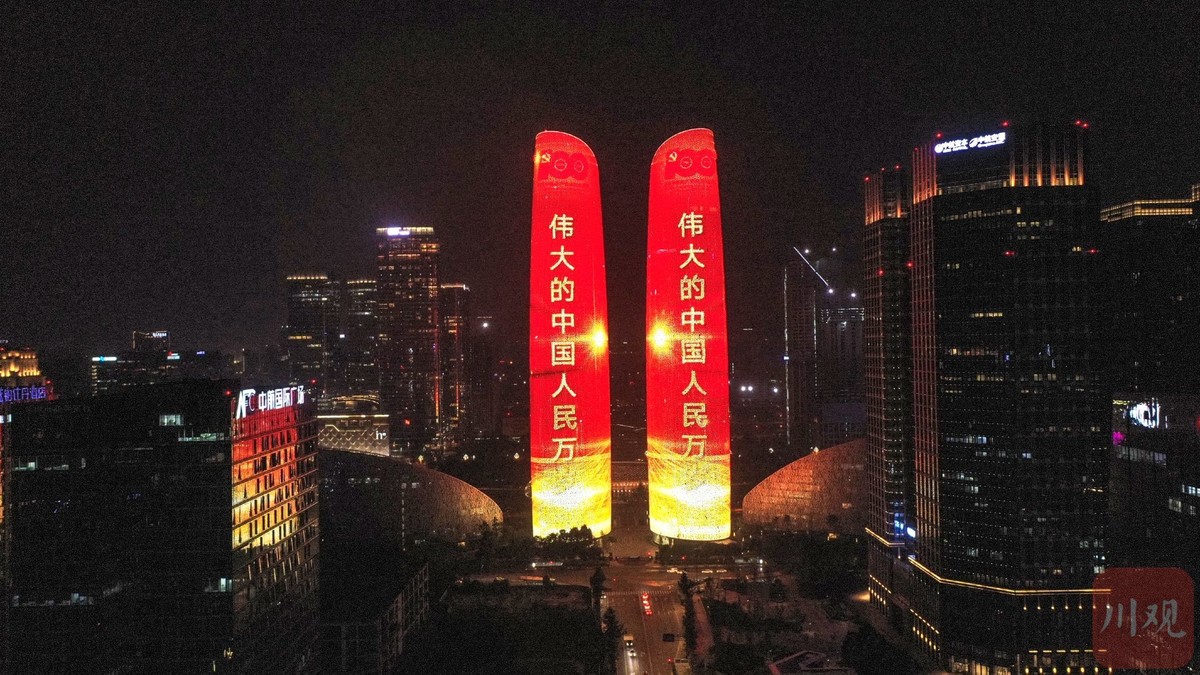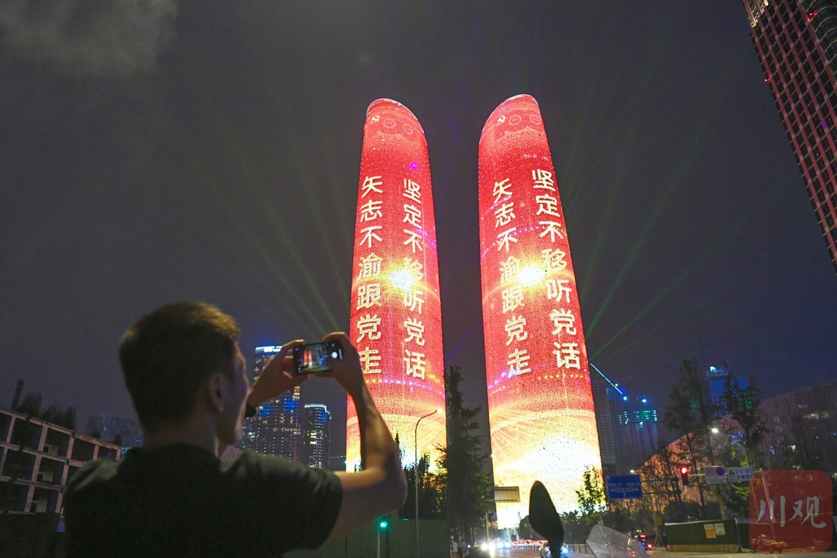 “热烈庆祝中国共产党成立100周年!”“百年征程波澜壮阔,百年初心历久弥坚”……6月23日晚20:30,成都金融城天府双子塔52000平方米的巨幕上,一条条主题口号点亮夜空,熠熠生辉。