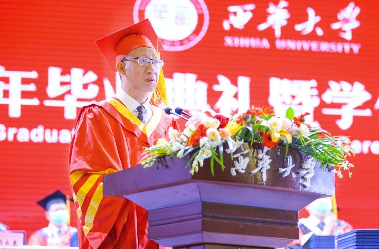 校学位评定委员会主席、校长刘树根以《在百年党史中感悟初心与使命 在奋斗征程中肩负责任与担当》为题,向全体毕业生送上临别寄语和真挚祝福。他回顾了与2021届毕业生一起经历和见证的重要时刻和事件,细数毕业生在西华求学生涯中取得的骄人成绩,赞扬了毕业生用奋斗诠释了青春风采和强烈的责任感,证明新时代的青年可堪大任。