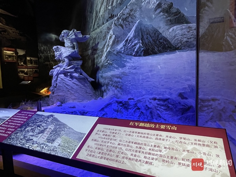 展览展示了红军翻越的主要雪山,这些雪山海拔大都在4000米以上,也包括中央红军成功翻越第一座大雪山——夹金山。1935年6月,中央红军翻越夹金山,与红四方面军先头部队在夹金山北麓达维会师。之后,红一、红四方面军在懋功天主教堂举行联欢会,热烈庆祝两军会师。懋功会师是红军长征途中继遵义会议后的又一重大历史事件。