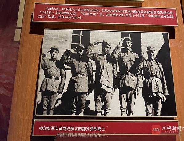 展览中,何哲生的画作《彝区结盟》展示了1935年5月,红军进入大凉山冕宁县彝族聚居区,刘伯承与彝族果基部落首领小叶丹歃血为盟的场景。彝海结盟后,中央红军建立了红军长征途中第一支少数民族武装力量,并将队旗赠送给了小叶丹。