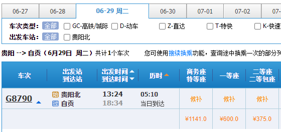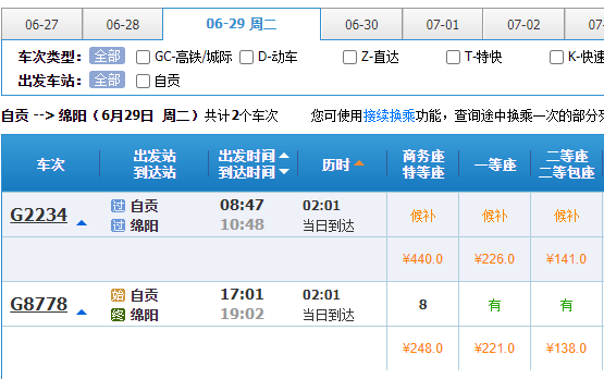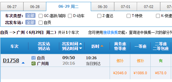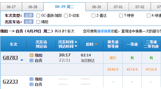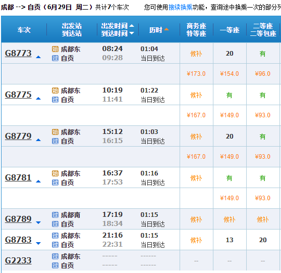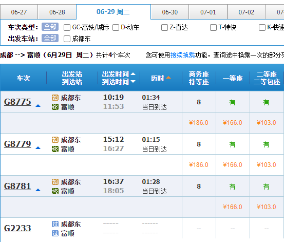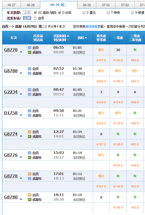 6月28日当天,自贡开往成都的动车票已可以购票,另外,成都东开往自贡,10点19分、11点30分、15点12分与16点37分等班次均有余票。二等座价格在93元,一等座149元。