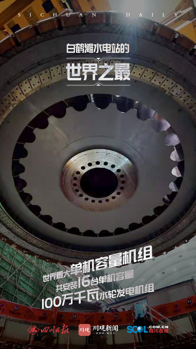 白鹤滩水电站共设计安装16台单机容量为100万千瓦的水轮发电机组,是全球单机容量最大的水电机组,也是中国自主设计制造的完全国产化百万千瓦机组。