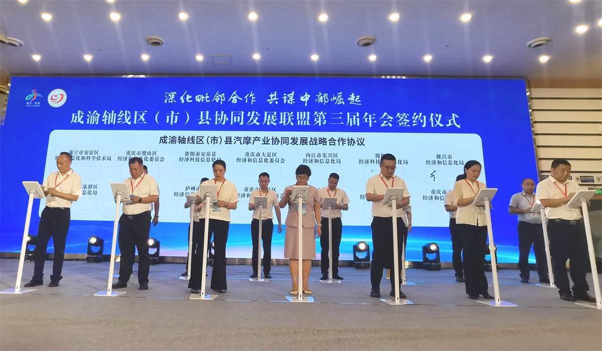 在会议现场,成渝轴线上14个区(市)县正式签署了《成渝轴线区(市)县汽摩产业协同发展战略合作协议》。