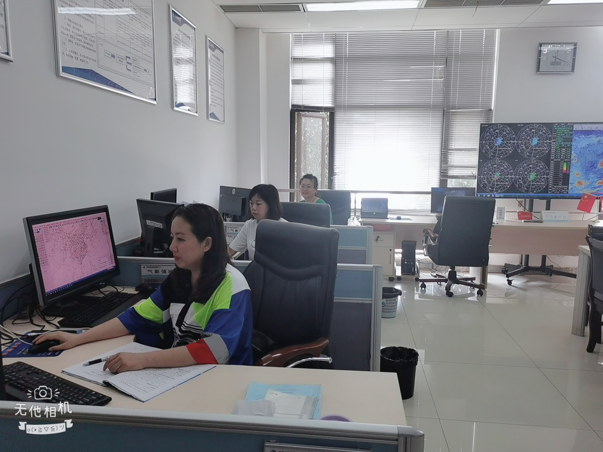 凉山州气象局白鹤滩水电站气象保障服务组部分成员正在制作专题预报产品。