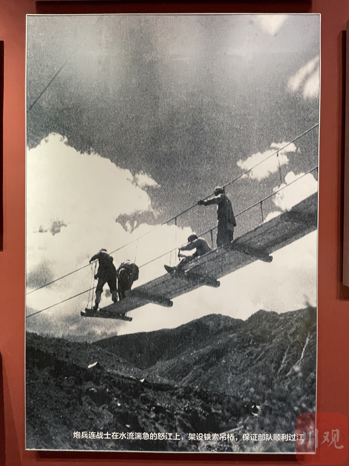 一张张老照片,还原了当时的建设现场:崖壁上,战士们站在吊桥上作业,上下都要通过数十米高的“云梯”;腰间系着安全绳,一人持铁凿、一人抡手锤,互相搭配,在怒江边上的悬崖绝壁上开凿公路;水流湍急的江河上,战士们手工作业、架设铁索吊桥……