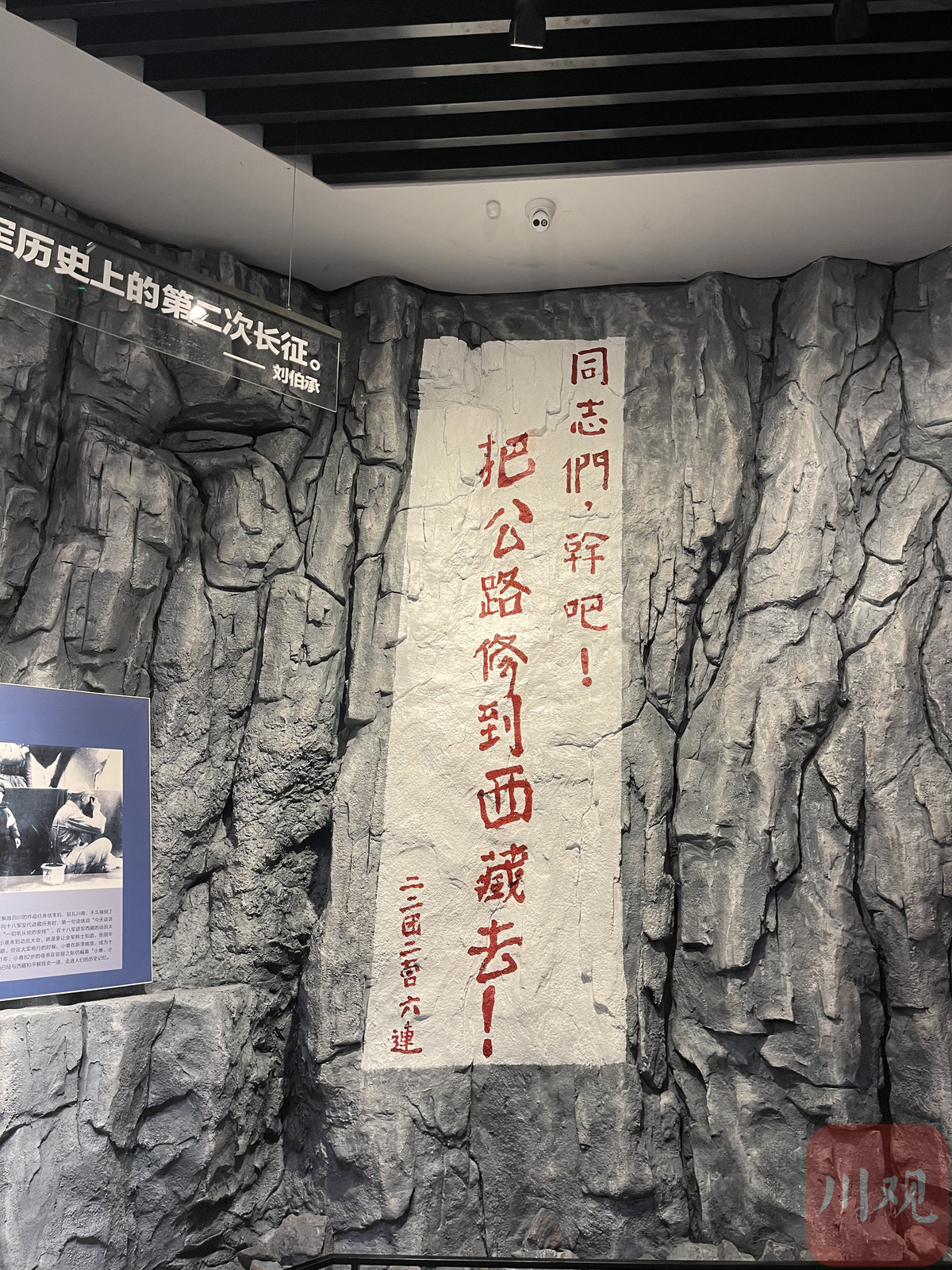 “同志们,干吧!把公路修到西藏去!二二团二营六连。”刚走进博物馆,这个刻在岩石上、简单有力的标语,让人热血沸腾——它生动再现了川藏公路的建设背景和精神气魄。