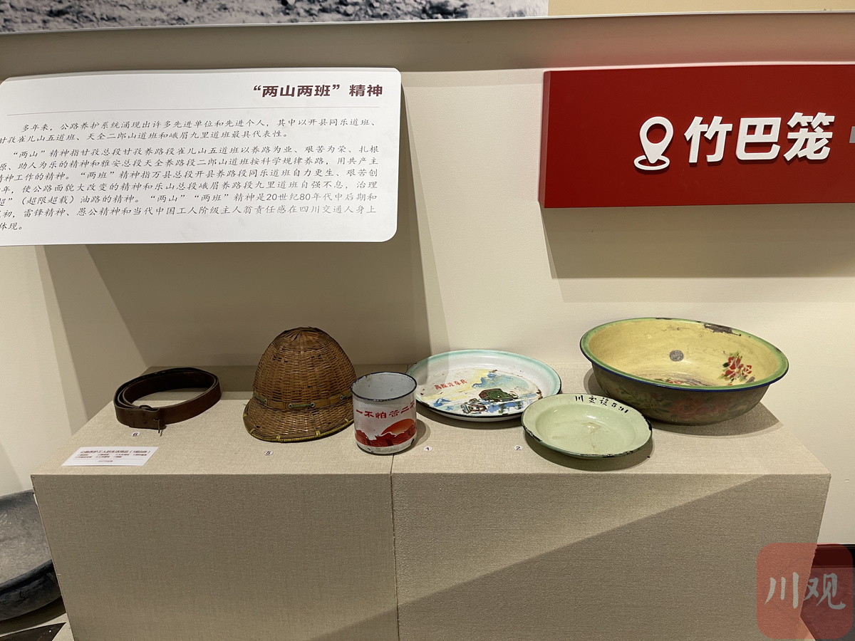 博物馆里的一组展品,可见当年建设之辛。1950年至1954年期间使用的筑路工具,一组7件,有十字镐、手锤、铁凿、工兵铲等,都是手工工具;两个钢盔大小、外面罩着藤条编织网的帽子,就是“安全帽”。