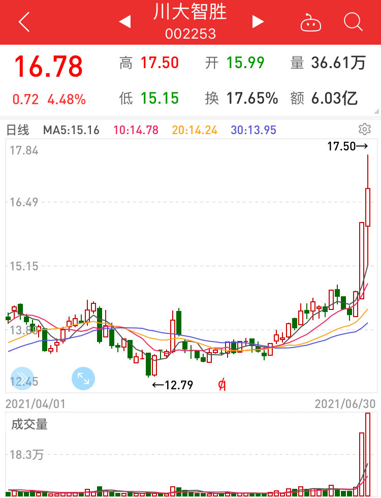 但是,截至今日收盘,川大智胜的股价报16.78元,涨幅4.48%。