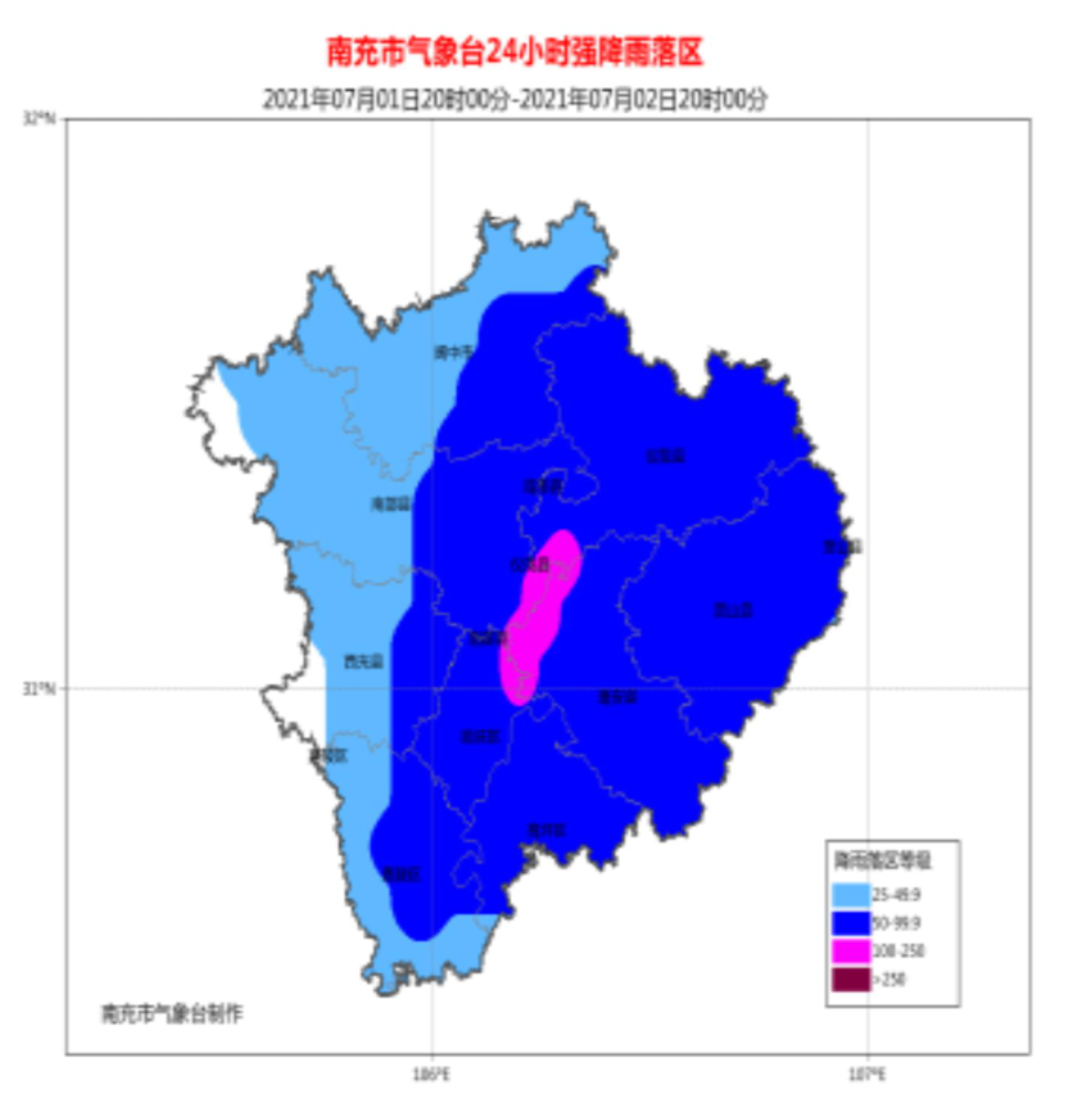 ★ 南充市气象台7月1日发布暴雨蓝色预警:1日20时到2日20时,南充市各县(市、区)有一次强降水天气过程,雨量大雨到暴雨(30-80mm),个别地方大暴雨(100-120m),过程伴有雷电、短时强降水和阵性大风等对流性天气。
