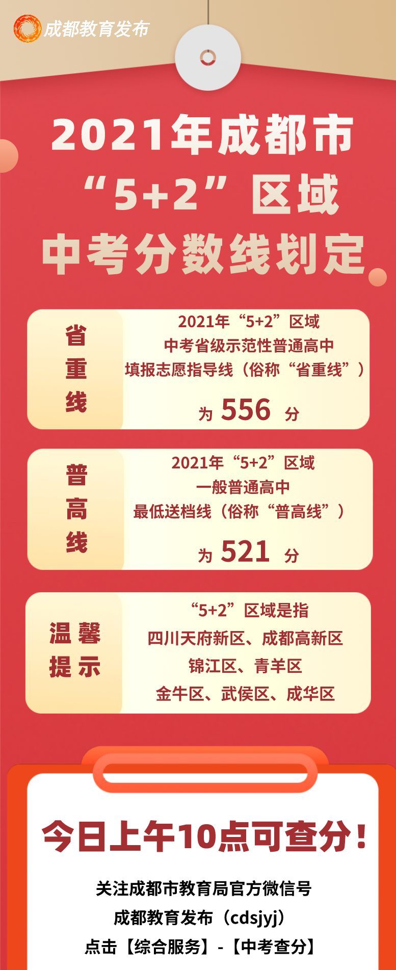 记者从成都市教育局获悉,2021年成都中考省重线为556 ,普高线为521 。