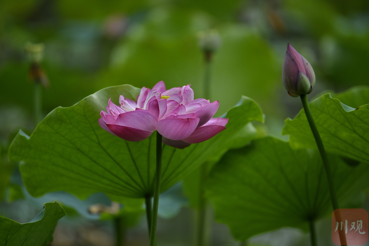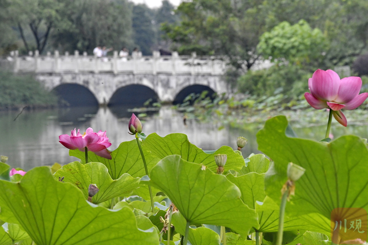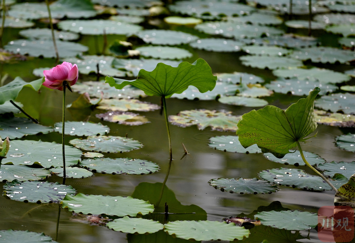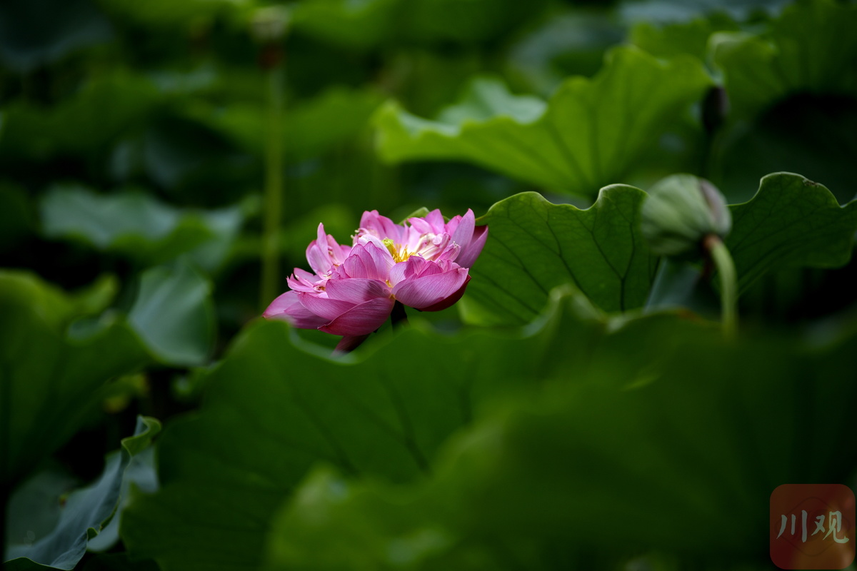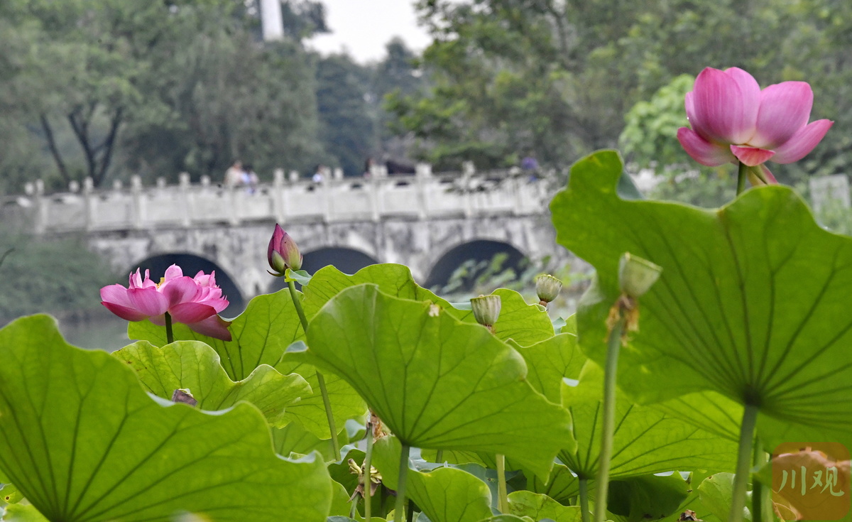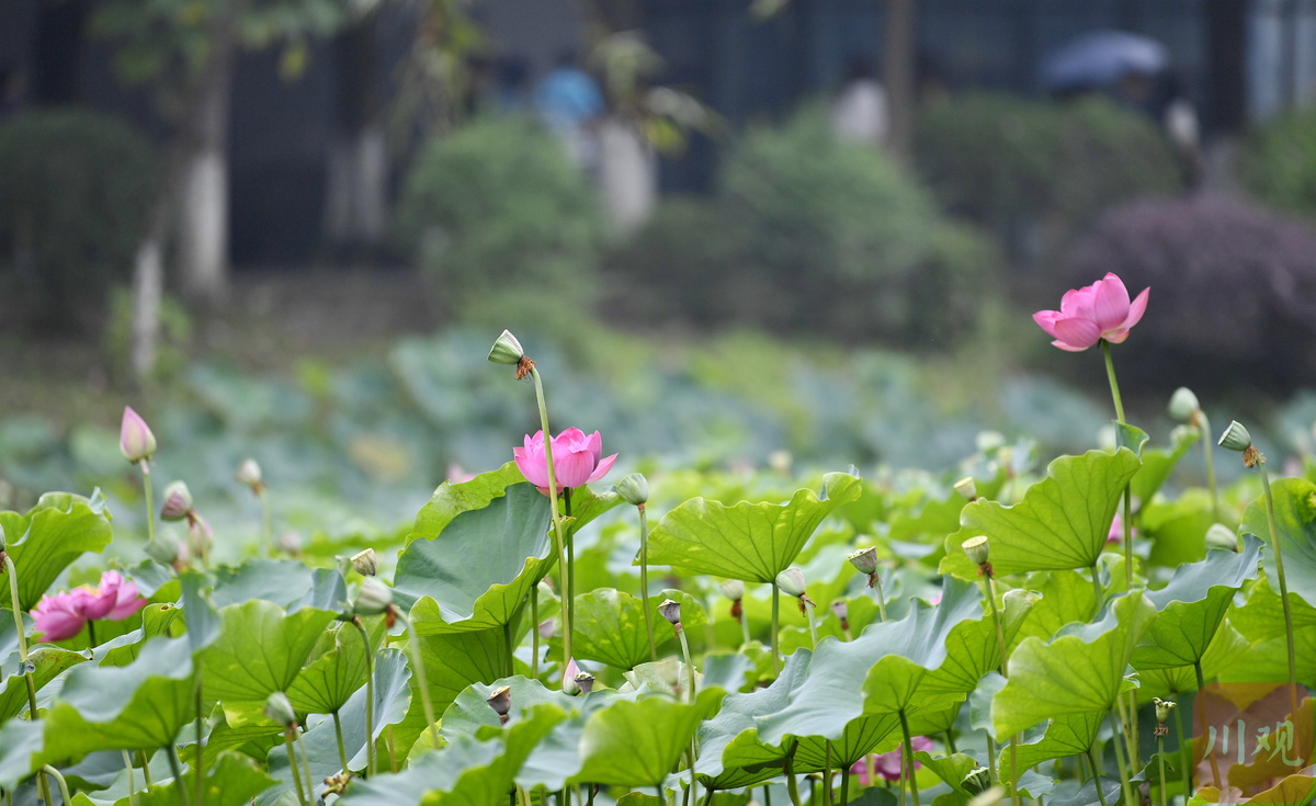 7月6日,记者在成都工业学院九洲湖荷塘看到,湖两侧粉红色的荷花正星星点点的绽放,迸发出抚慰人心的宁静,湖内荷叶郁郁葱葱,更多的花蕾含苞欲放,未长成的莲蓬在空中摇曳,有的莲蓬还在荷花花瓣中间,呈嫩黄色。