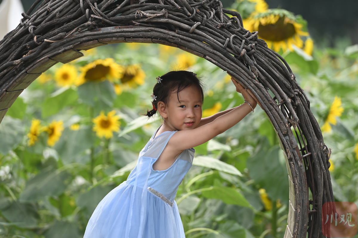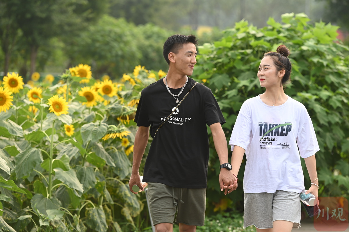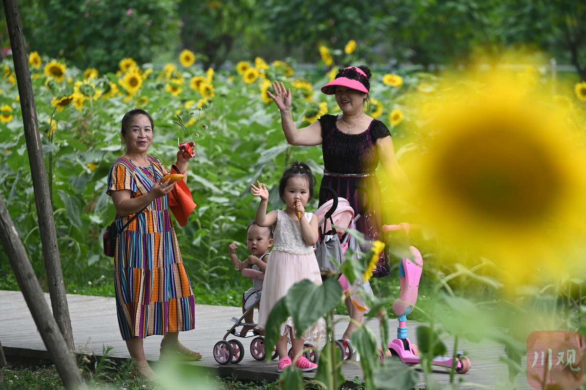 7月6日下午,川观新闻记者来到天府芙蓉园,看到近4万平方米的向日葵已进入盛花期,微风拂过,漾起一波又一波金色波浪。众多市民穿梭在花海里,或放松心情拍照打卡,或与家人漫步其间,零距离亲近着这专属夏日的浪漫。