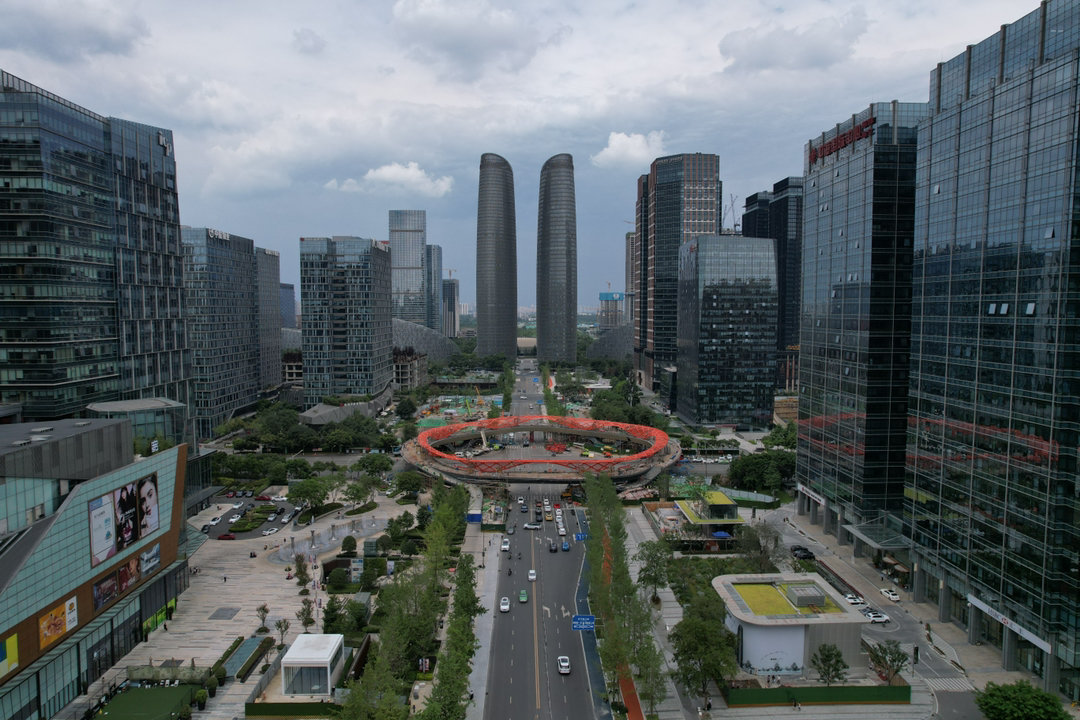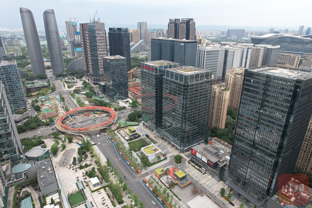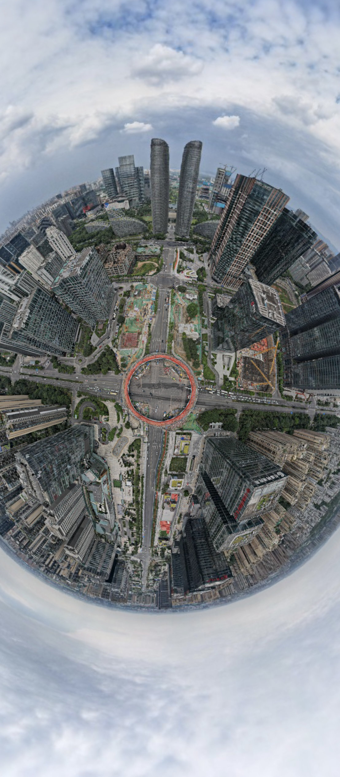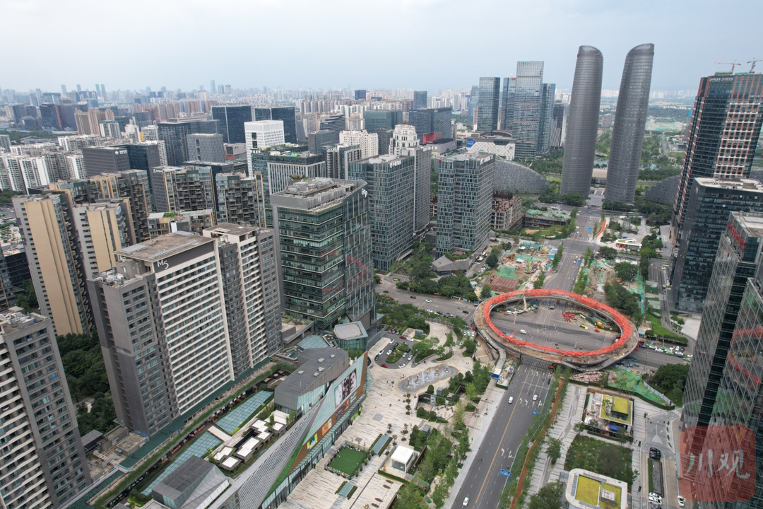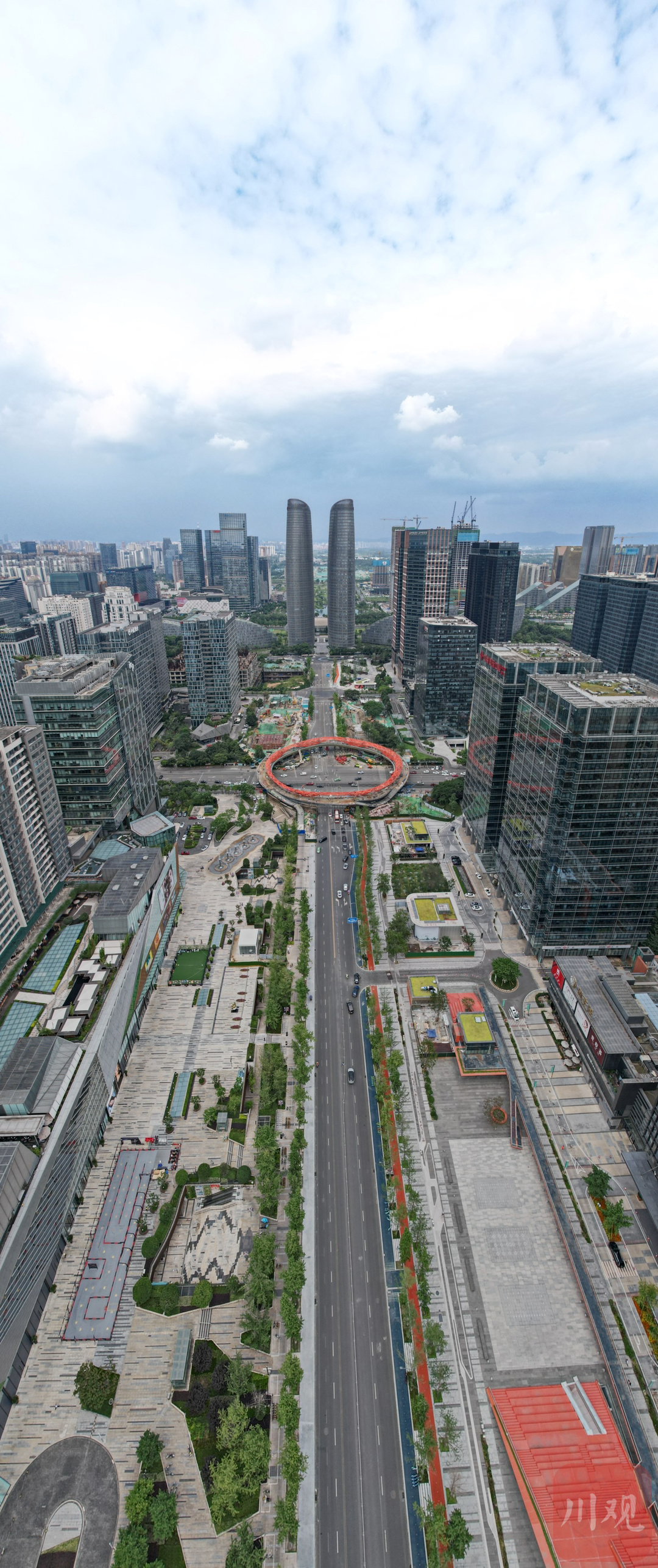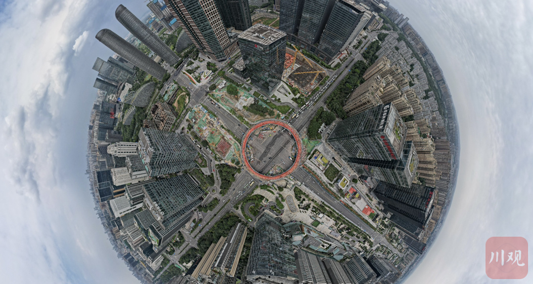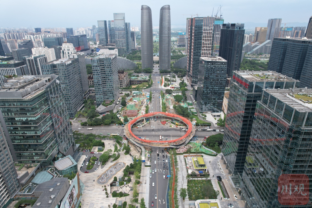 “交子之环”位于双子塔正对面,采用中国红的颜色,在蓝天下显得格外醒目;桥上独特的网状结构,具有灵动的设计感。交子之环将是国内首座拥有多元场景的人行天桥,目前已经完成全桥及廊架钢结构合龙,雏形初现啦!期待亮相!