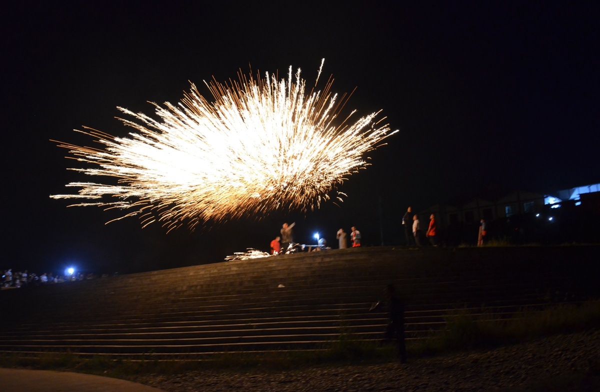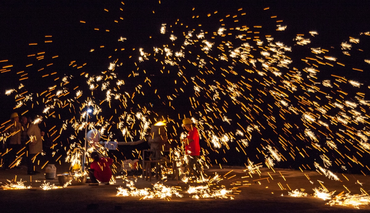 在鼓风机的助推下,通红的炉火让铁水融化。两名非遗传承师傅,一人舀出铁水,将铁水抛起,一人用木板奋力打向空中,铁水迅速崩裂开来,致使天空铁花飞溅,烟花闪耀,爆竹声声。火树银花点亮夜空,转瞬即逝,灿烂夺目,蔚为壮观……