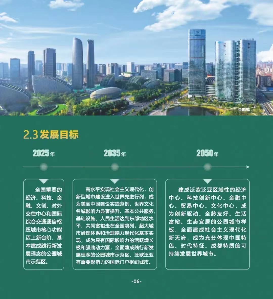 到2050年,成都将全面建成社会主义现代化新天府,成为充分体现中国特色、时代特征、成都特质的可持续发展世界城市。
