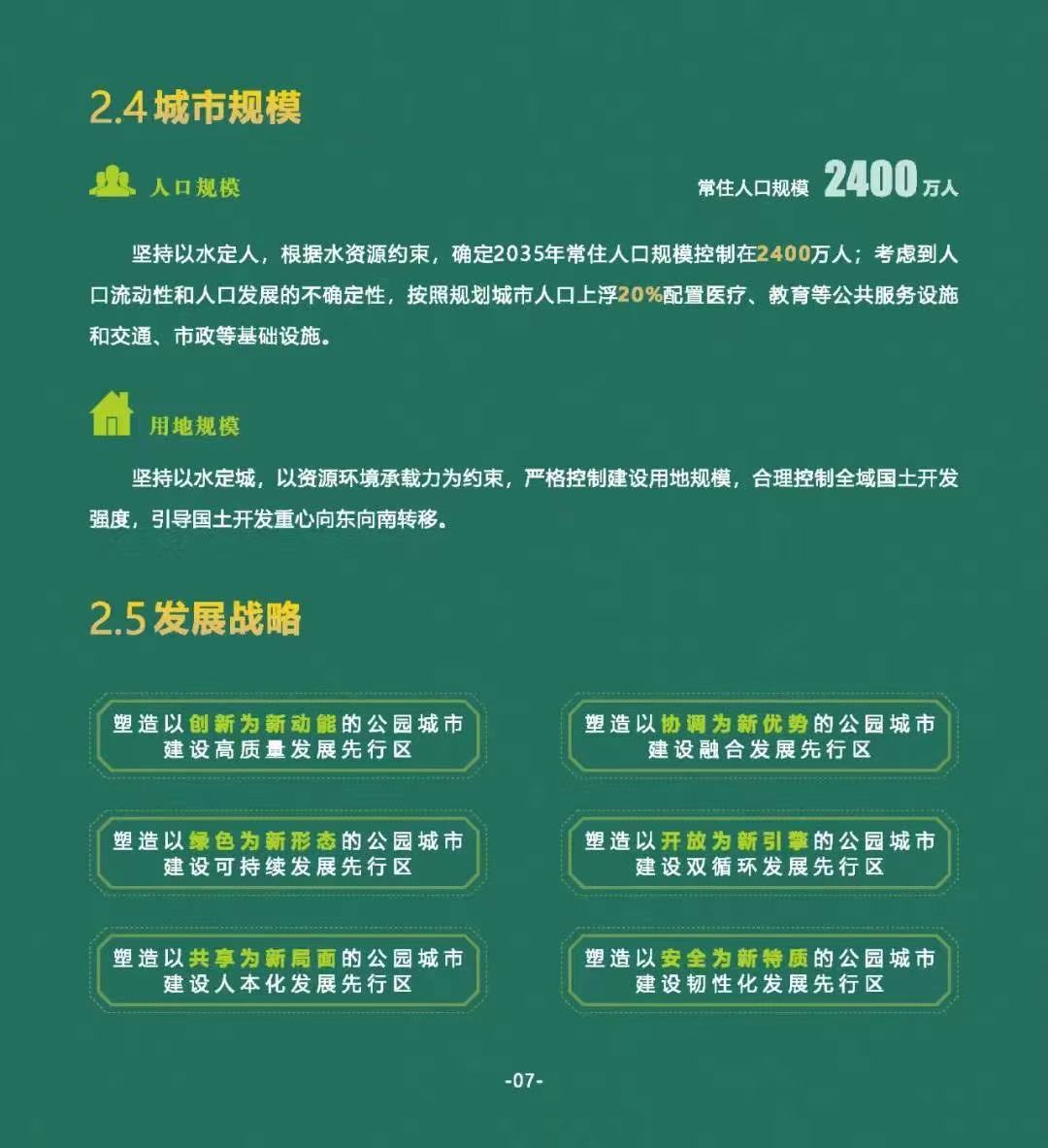 在城市规模上,《规划》草案提出2035年常住人口规模控制在2400万人,考虑人口流动性和人口发展的不确定性,按照规划城市人口上浮20%配置医疗、教育等公共服务设施和交通、市政基础设施。严格控制建设用地规模,合理控制全域国土开发强度,引导国土开发中心向东向南转移。