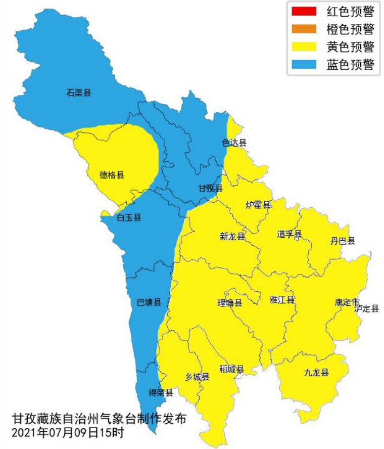 7月9日,甘孜州气象台发布地质灾害气象风险预警,据最新气象资料分析,预计:9 日晚~11日白天,州内大部地区有中到大雨,部分乡镇有暴雨。降水过程中可能伴有短时强降水、冰雹、雷电、大风等强对流天气。地质灾害气象风险等级:德格、新龙、炉霍、道孚、丹巴、康定、泸定、九龙、雅江、理塘、乡城、稻城、色达南部为Ⅲ级(黄色,风险较高);石渠、甘孜、白玉、巴塘、得荣、色达北部为Ⅳ级(蓝色,有一定风险)。
