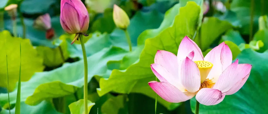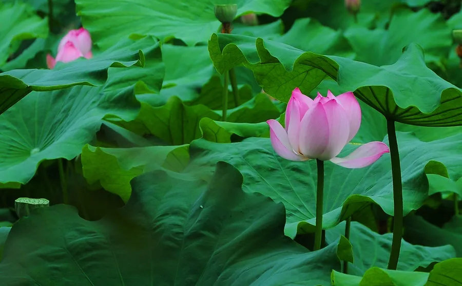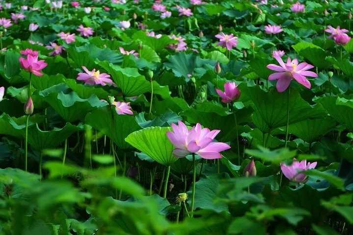 漫步在荷塘栈道上,只见碧绿的荷叶如一把把小伞,在荷塘中随风摇曳,泛起层层绿浪。各色荷花已相继绽放,白如雪、粉似霞,粉红相间的花儿争相竞馥。游客朋友俯下身轻嗅荷花的清香,或用手机、相机记录下它们美丽的“倩影”。