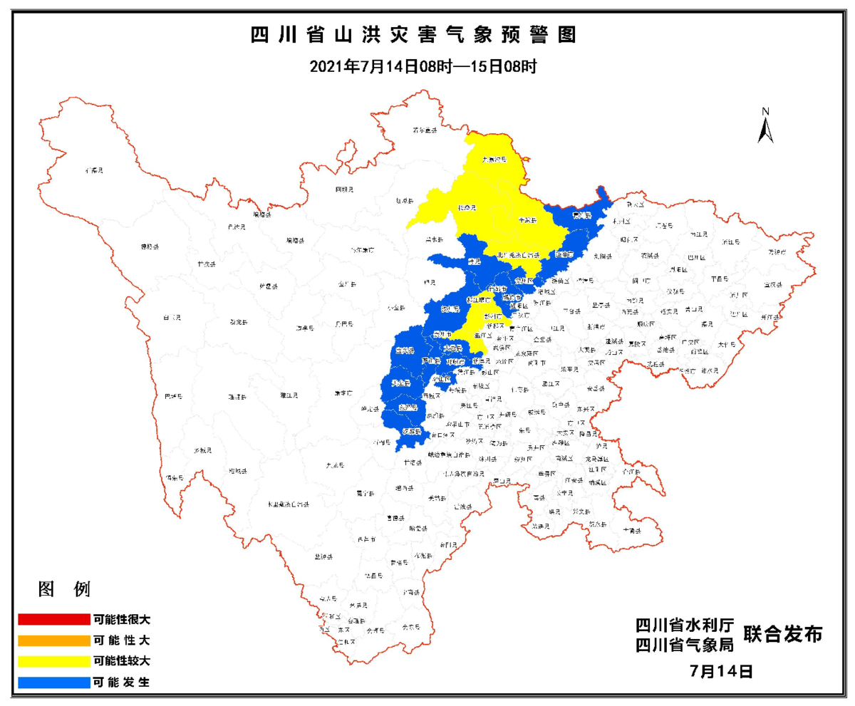 7月14日8时至15日8时,平武、北川、安州、九寨沟、松潘、都江堰、彭州、崇州等县(市、区)发生山洪灾害可能性较大(黄色);江油、青川、绵竹、什邡、大邑、蒲江、邛崃、汉源、石棉、芦山、宝兴、荥经、天全、汶川、茂县等县(市、区)可能发生山洪灾害(蓝色)。
