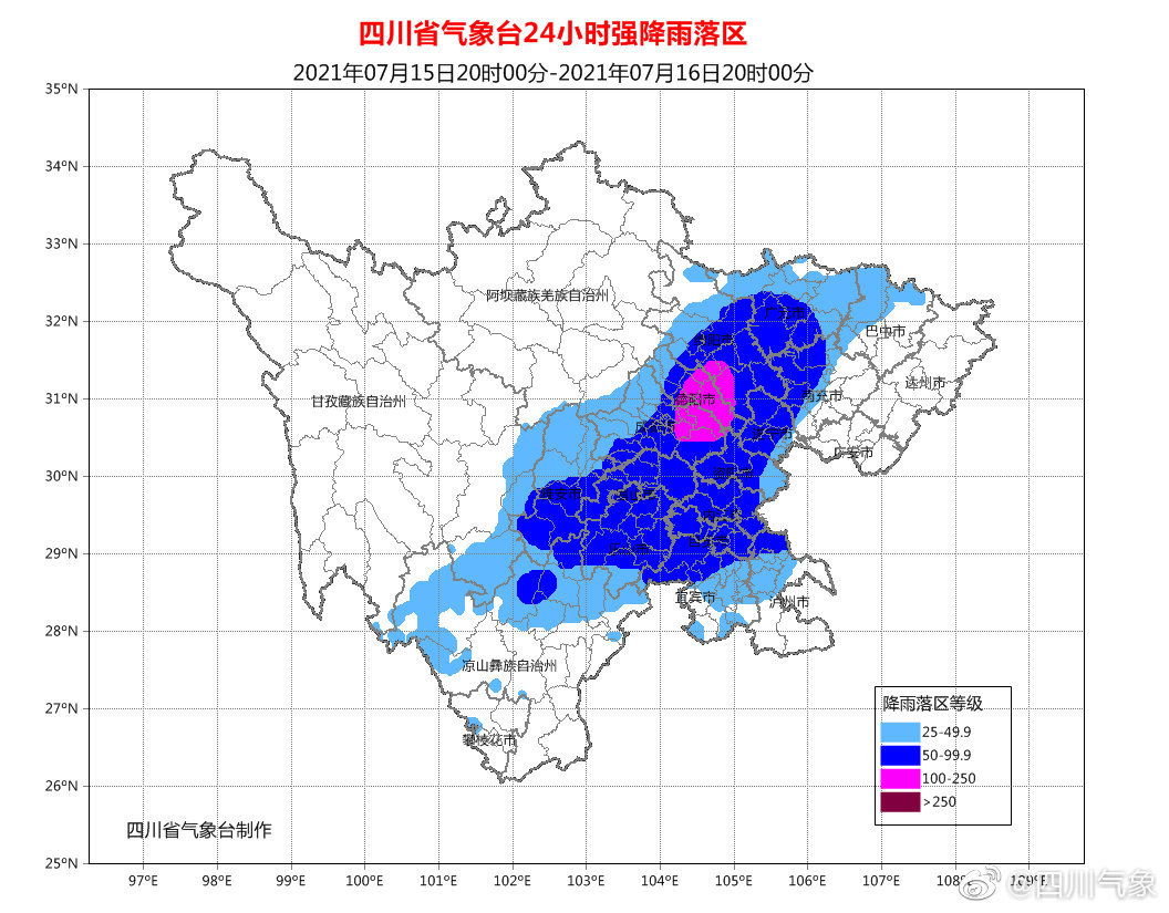 15日20时到16日20时,眉山、乐山、内江、自贡4市,成都、绵阳、德阳3市东部,南充、遂宁、资阳3市西部,广元、雅安2市南部,宜宾、泸州2市北部有暴雨(雨量50-80毫米),其中绵阳、德阳、成都3市东部有大暴雨(雨量150-180毫米)。并伴有雷电和雷暴大风天气。甘孜州东部和凉山州北部有大雨,局部暴雨。