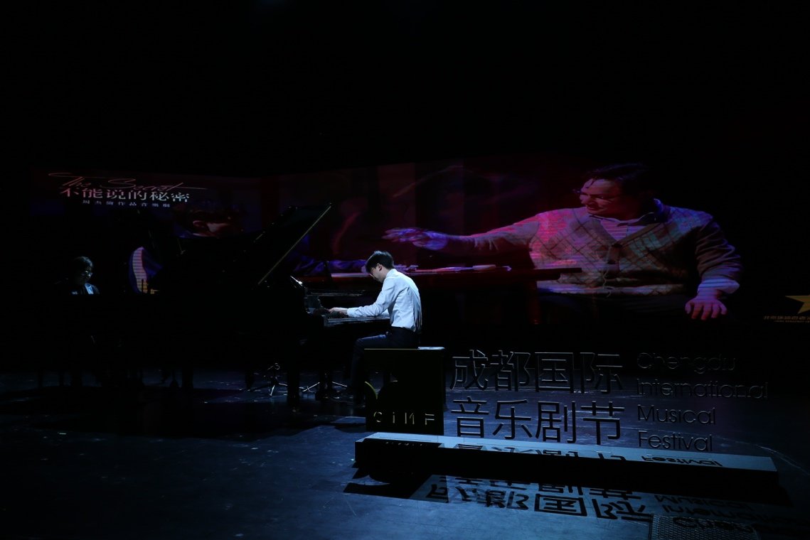 两架钢琴摆在舞台中央,两位演奏者登台“斗琴”,动人的音符从指尖流出,背后荧幕显示的是音乐剧《不能说的秘密》的精彩片段……