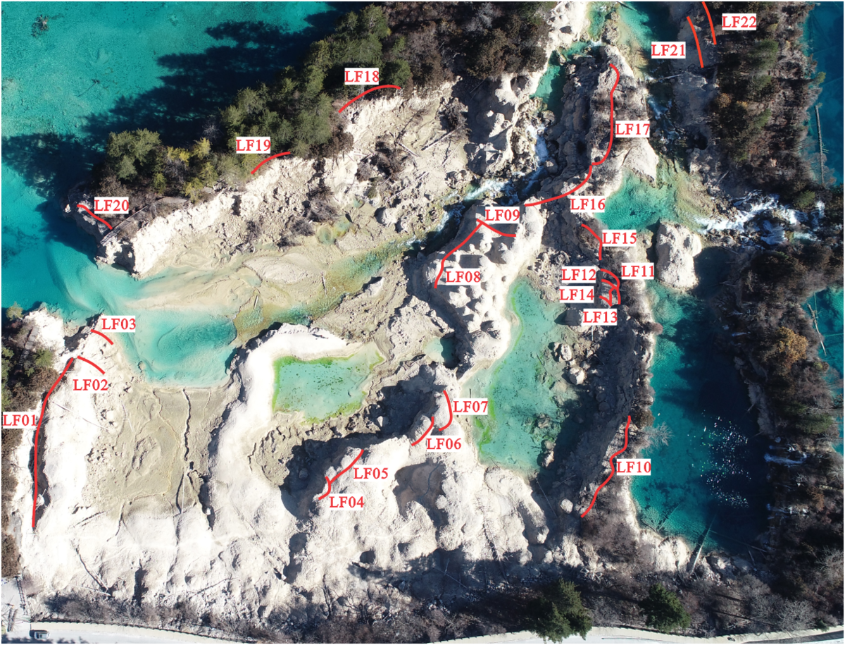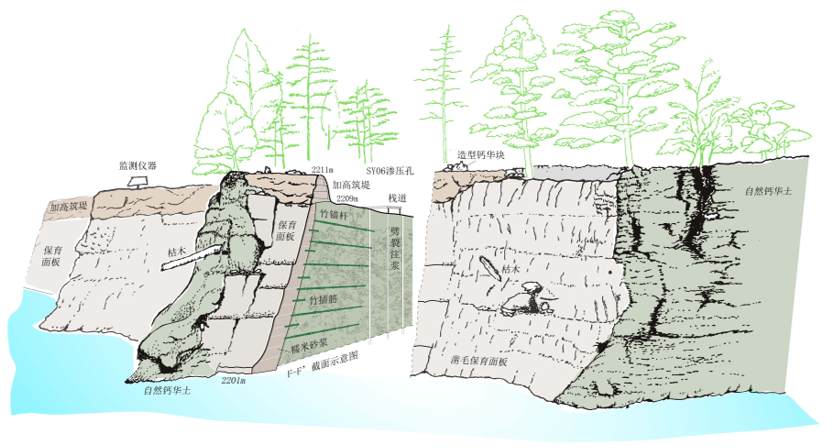 2017年“8·8”九寨沟7.0级地震导致火花海堤坝溃决,形成长40米、宽12米、深15米的决口,湖泊干涸;湖区发育裂缝100余条,5米以上的就有23条。震后一年,由于失去水分涵养,火花海湖群钙华堤坝迅速沙化、风化,持续垮塌。受强降雨影响,湖群决堤风险陡增,严重威胁下游人们生命财产和景观景点的安全。