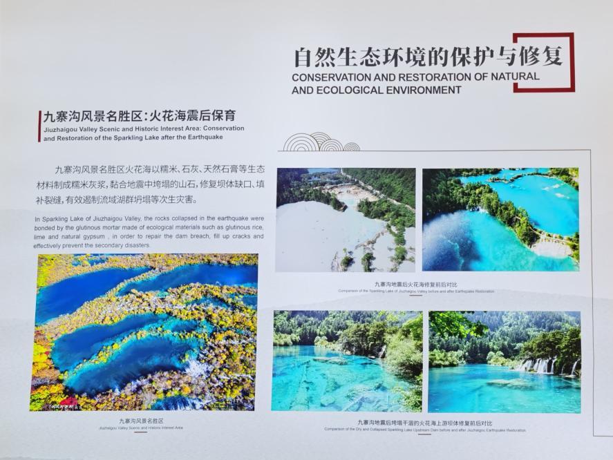 震后,九寨沟管理局多次邀请专家现场勘查,通过科学论证和方案比选,确定了以糯米灰浆传统材料和地震中垮塌的块石和钙华土等修复恢复火花海湖群坍塌堤坝缺口与裂缝的技术方案,得到了联合国教科文组织、世界自然保护联盟的肯定支持;联合成都理工大学等单位创制了“振冲碎石固基、糯米灰浆筑坝、竹锚加筋护坡、生态材料堵缝、分形景观设计、本土植物绿化”的技术体系,还原了火花海溃坝前地下水渗流、地表水溢流、生态水供给、大气降水调控,维持了钙华沉积平衡,恢复了震前生态系统。