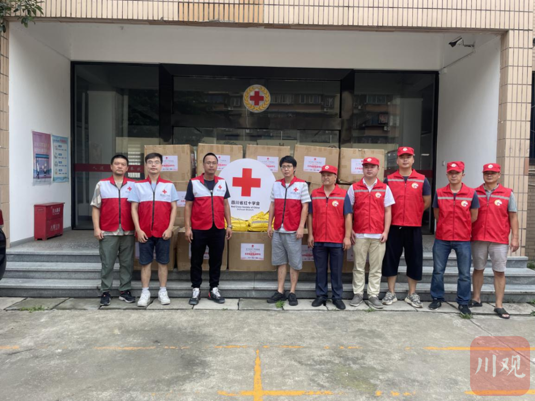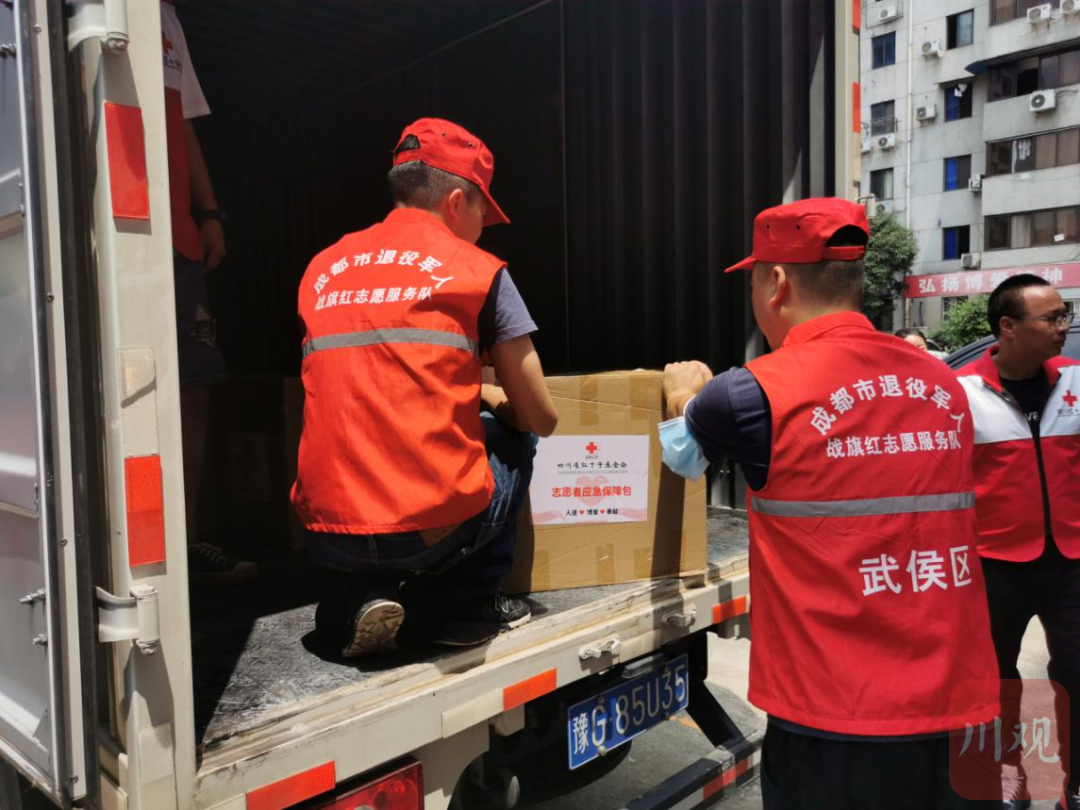成都市退役军人战旗红志愿服务队积极响应省红十字会号召,组织退役军人志愿者7月21日赶到救灾物资转运点,积极参与承担装载任务。